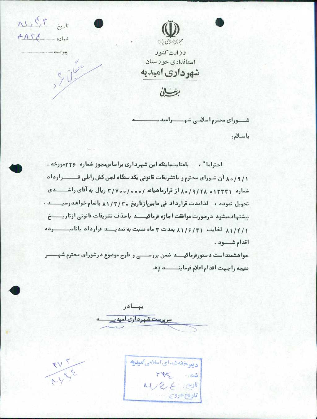۳-نامه شمـاره ۴۸۳۴مورخ۳/ ۴/ ۸۱ شهرداري مبني بر تمديدقراردادآقاي راشدي در زمينه بكارگيري يكدستگـاه لجن كش به قرارماهيـــانـه۰۰۰/ ۷۰۰/ ۳ريال (سه ميليون وهفتصدهزارريال)با حذف تشريفات قانوني از       تاريخ۱/ ۴/ ۸۱لغايت۳۱/ ۶/ ۸۱ بمدت۳ماه قرائت گرديدكـه پس از بحث وبررسي با۷رأي موافق به تصويب رسيـد.