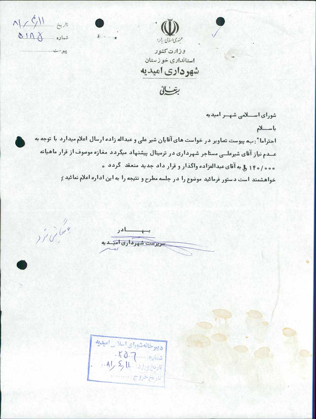 مصوبه شماره ۳ جلسه شماره ۲۷۵ مورخ ۸۱/۴/۱۱ شورای اسلامی شهر امیدیه