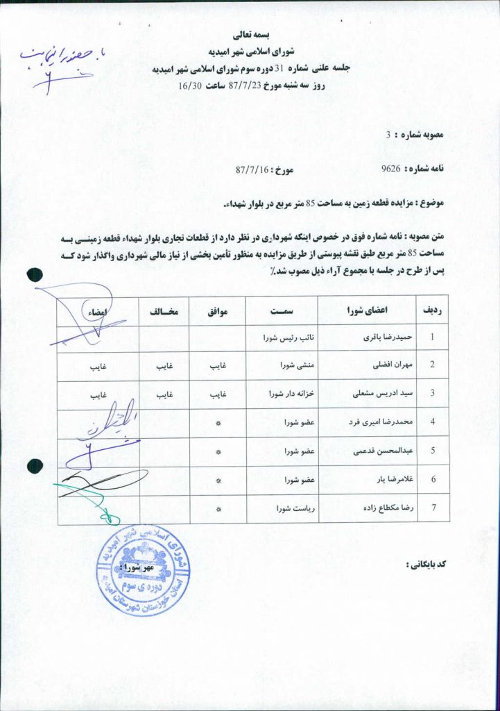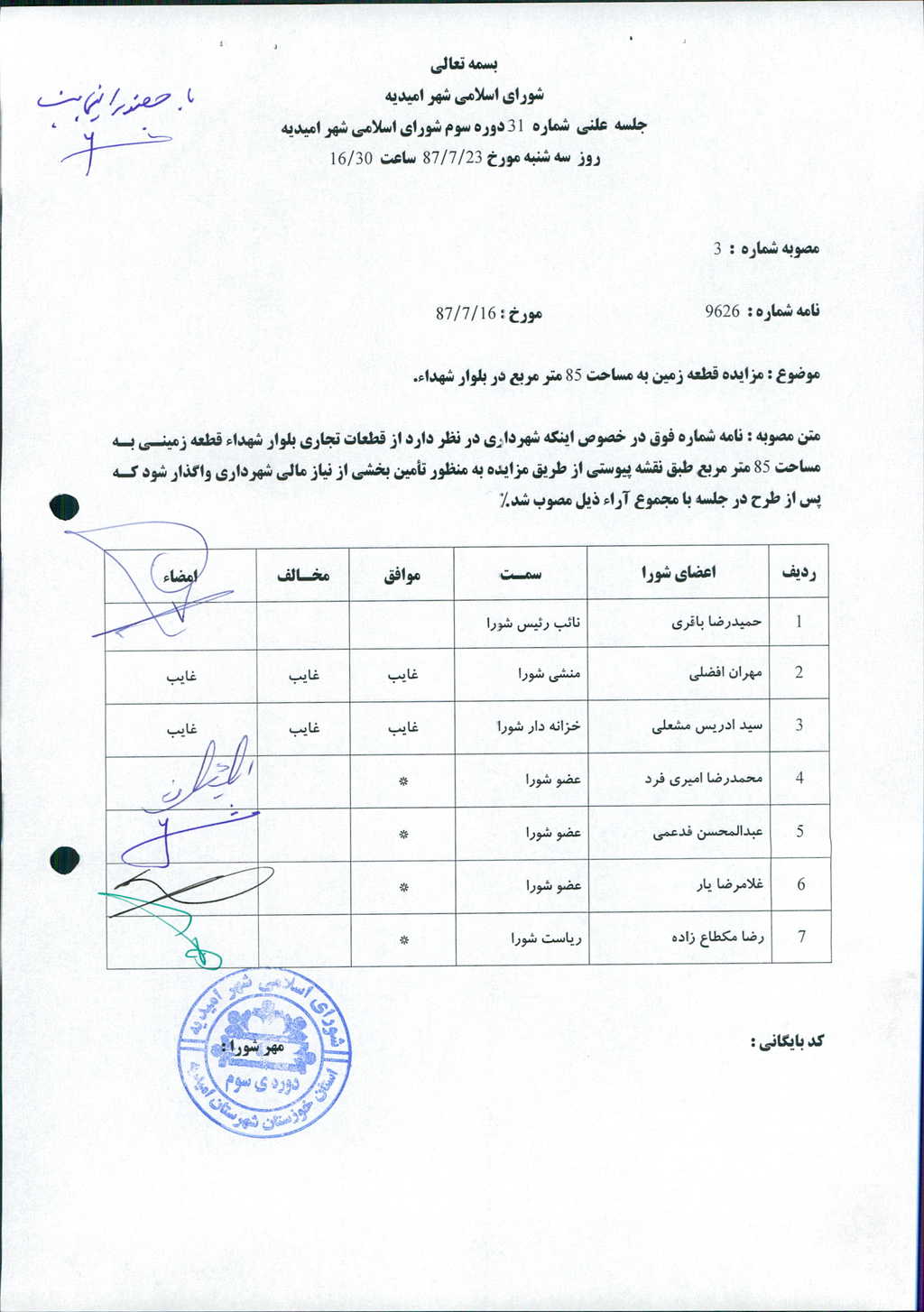 مصوبه شماره ۳ جلسه شماره ۳۱ شورای اسلامی شهر امیدیه