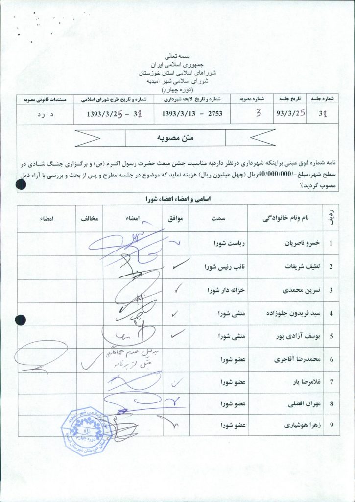مصوبه شماره ۳ جلسه شماره ۳۱ شورای اسلامی شهر امیدیه