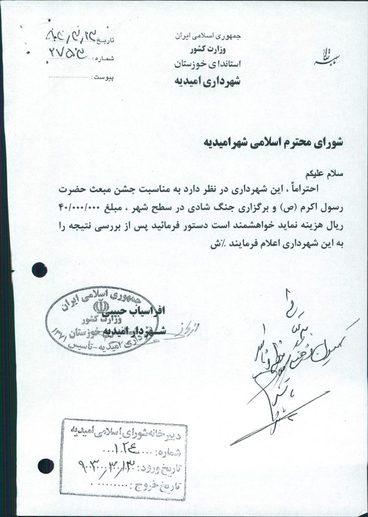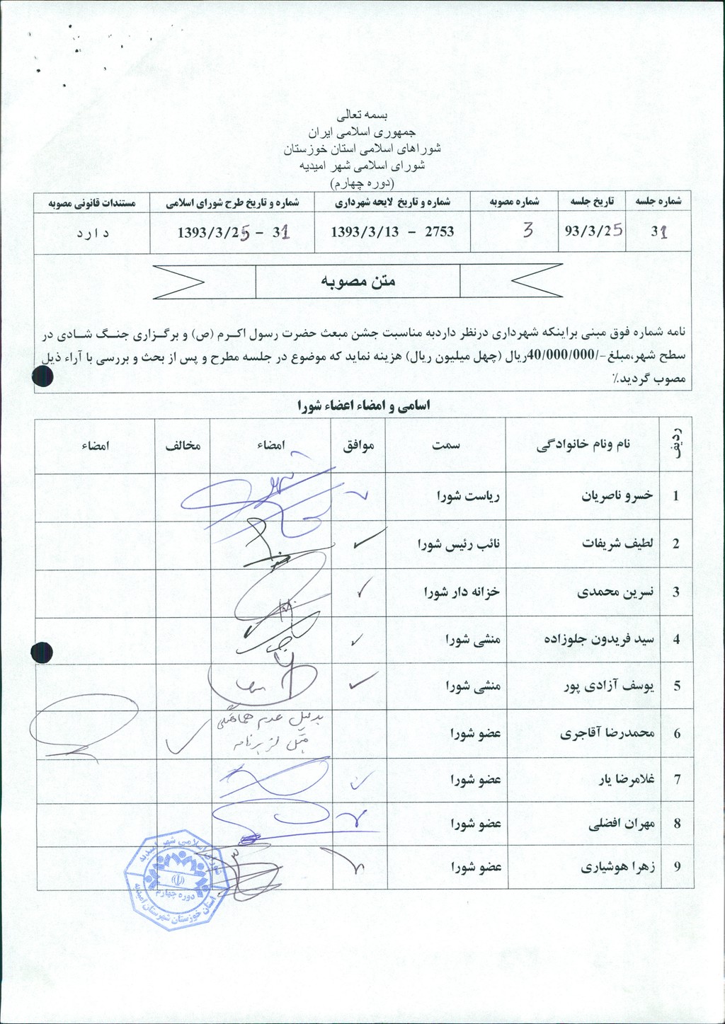 نامه شماره فوق شهرداری مبنی بر اینکه شهرداری در نظر دارد به مناسبت جشن مبعث رسول اکرم (ص) و برگزاری جنگ شادی در سطح شهر ، مبلغ ۴۰۰۰۰۰۰۰ریال (چهل میلیون ریال) هزینه نماید که موضوع در جلسه مطرح و پس از بحث و بررسی با مجموع آراء ذیل مصوب گردید%