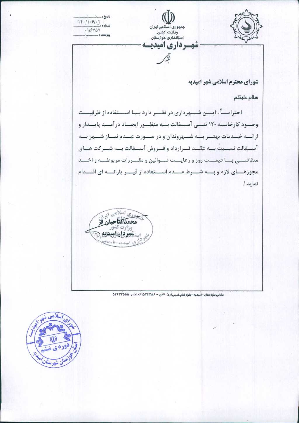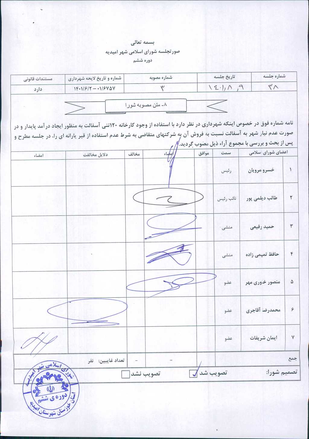 نامه شماره فوق در خصوص اینکه شهرداری در نظر دارد با استفاده از وجود کارخانه ۱۲۰تنی آسفالت به منظور ایجاد درآمد پایدار و در صورت عدم نیاز شهر به آسفالت نسبت به فروش آن به شرکتهای متقاضی به شرط عدم استفاده از قیر یارانه ای را ، در جلسه مطرح و پس از بحث و بررسی با مجموع آراء ذیل مصوب گردید.