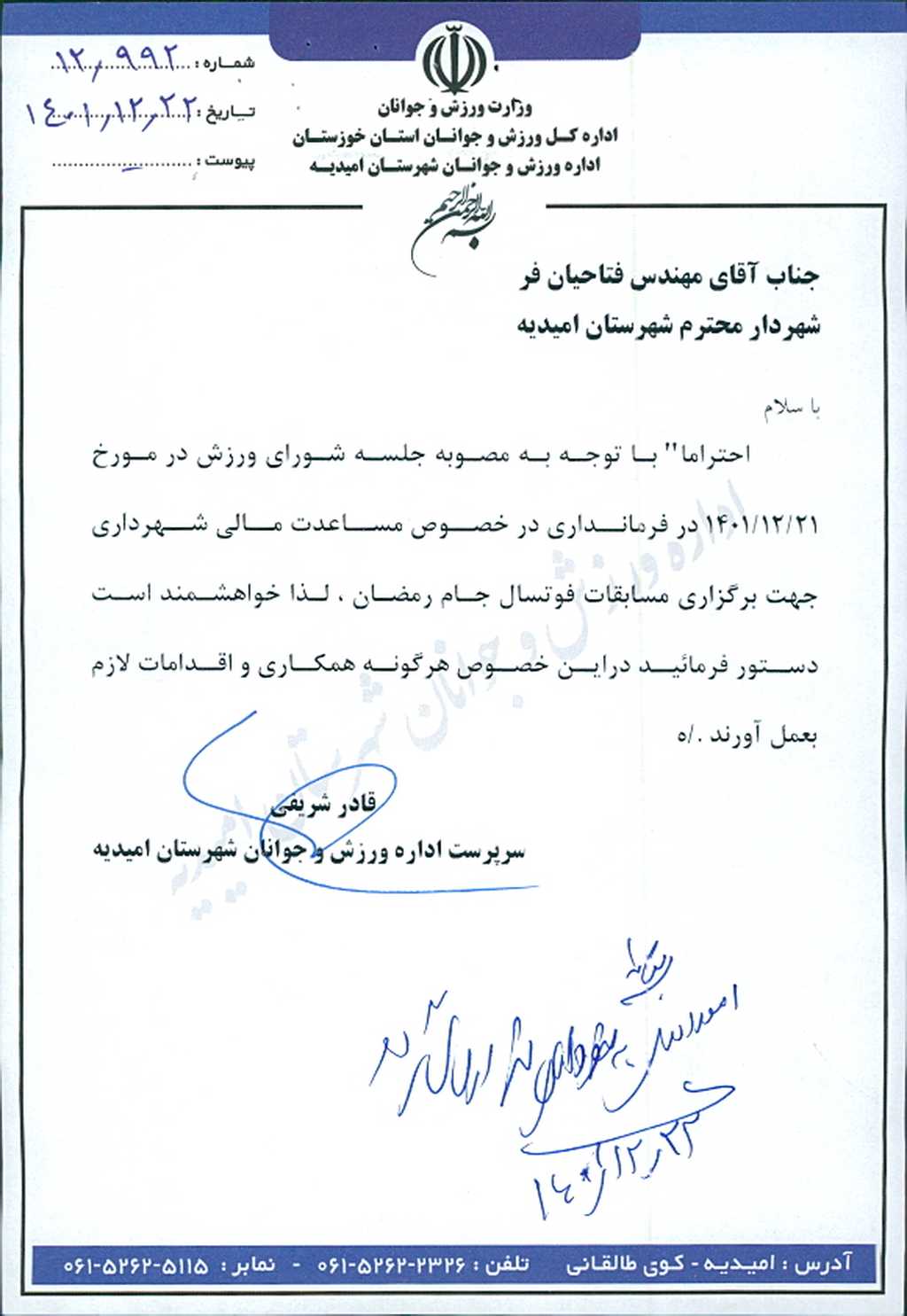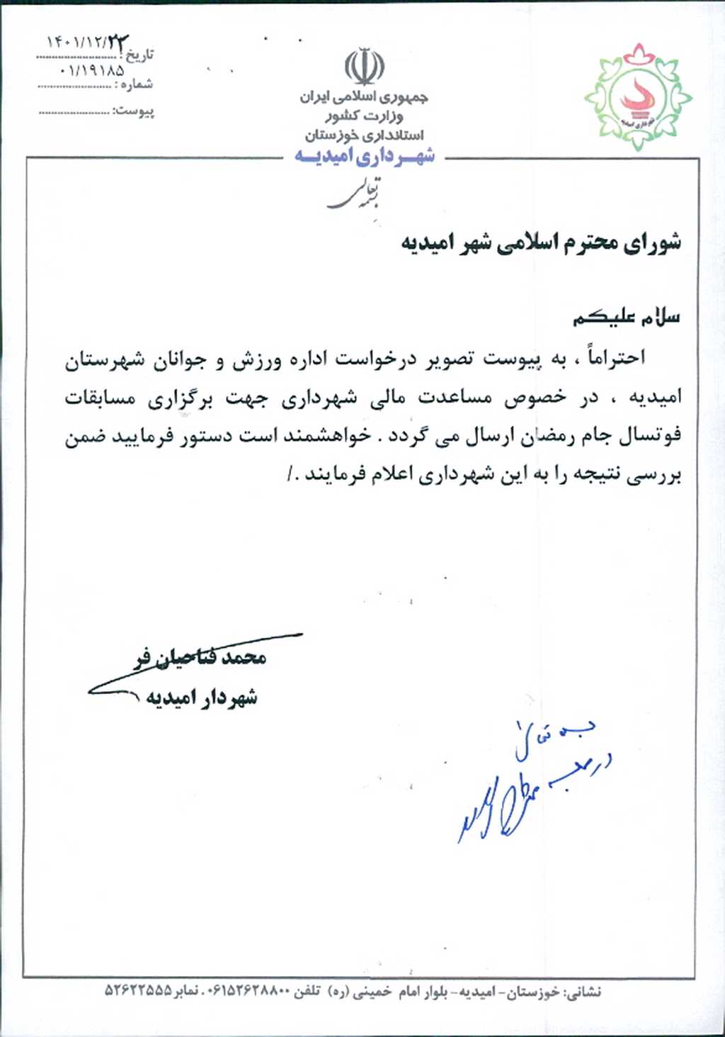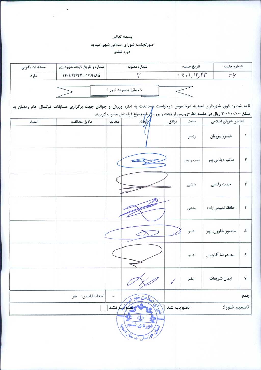 نامه شماره فوق شهرداری امیدیه درخصوص درخواست مساعدت به اداره ورزش و جوانان جهت برگزاری مسابقات فوتسال جام رمضان به مبلغ ۰۰۰/۰۰۰/ ۳۰۰ ریال در جلسه مطرح و پس از بحث و بررسی با مجموع آراء ذیل مصوب گردید.