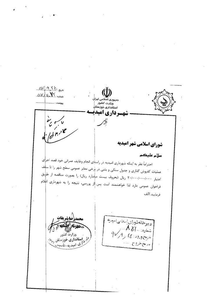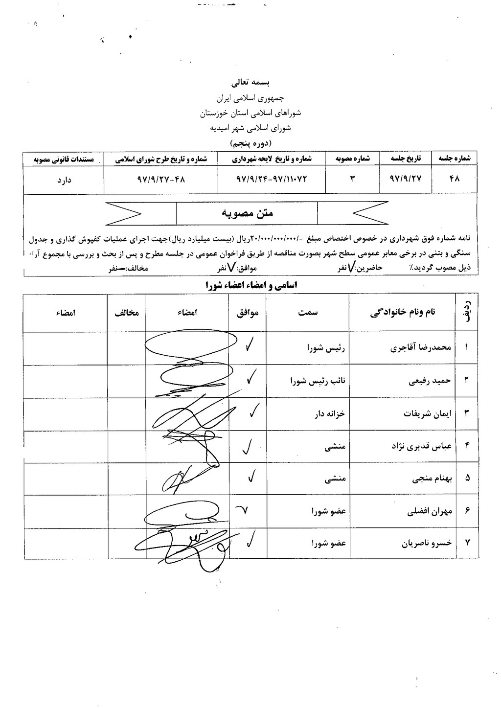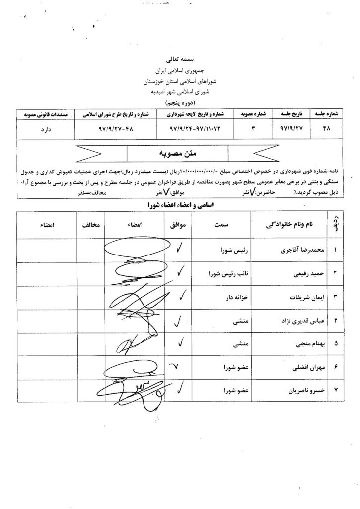 مصوبه شماره ۳ جلسه شماره ۴۸ مورخ ۹۷/۹/۲۷ شورای اسلامی شهر امیدیه