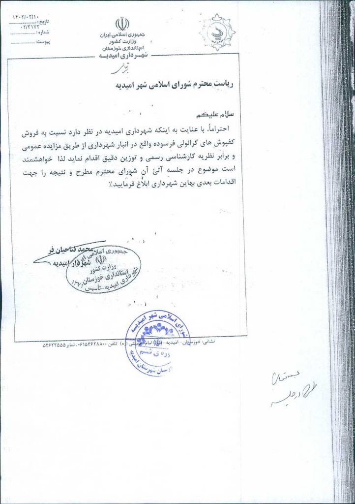 نامه شماره فوق شهرداري در خصوص فروش کفپوش های گرانولی فرسوده واقع درانبار شهرداری از طریق مزایده عمومی و برابر نظریه کارشناسی رسمی و توزین دقیق، در جلسه مطرح و پس از بحث و بررسي با مجموع آراء ذيل مشروط به غیر قابل استفاده بودن کفپوش ها و همچنین هزینه کرد مبالغ دریافتی حاصل از فروش در زمینه های خرید امکانات و وسایل بازی در پارک های سطح شهر مصوب گرديد.