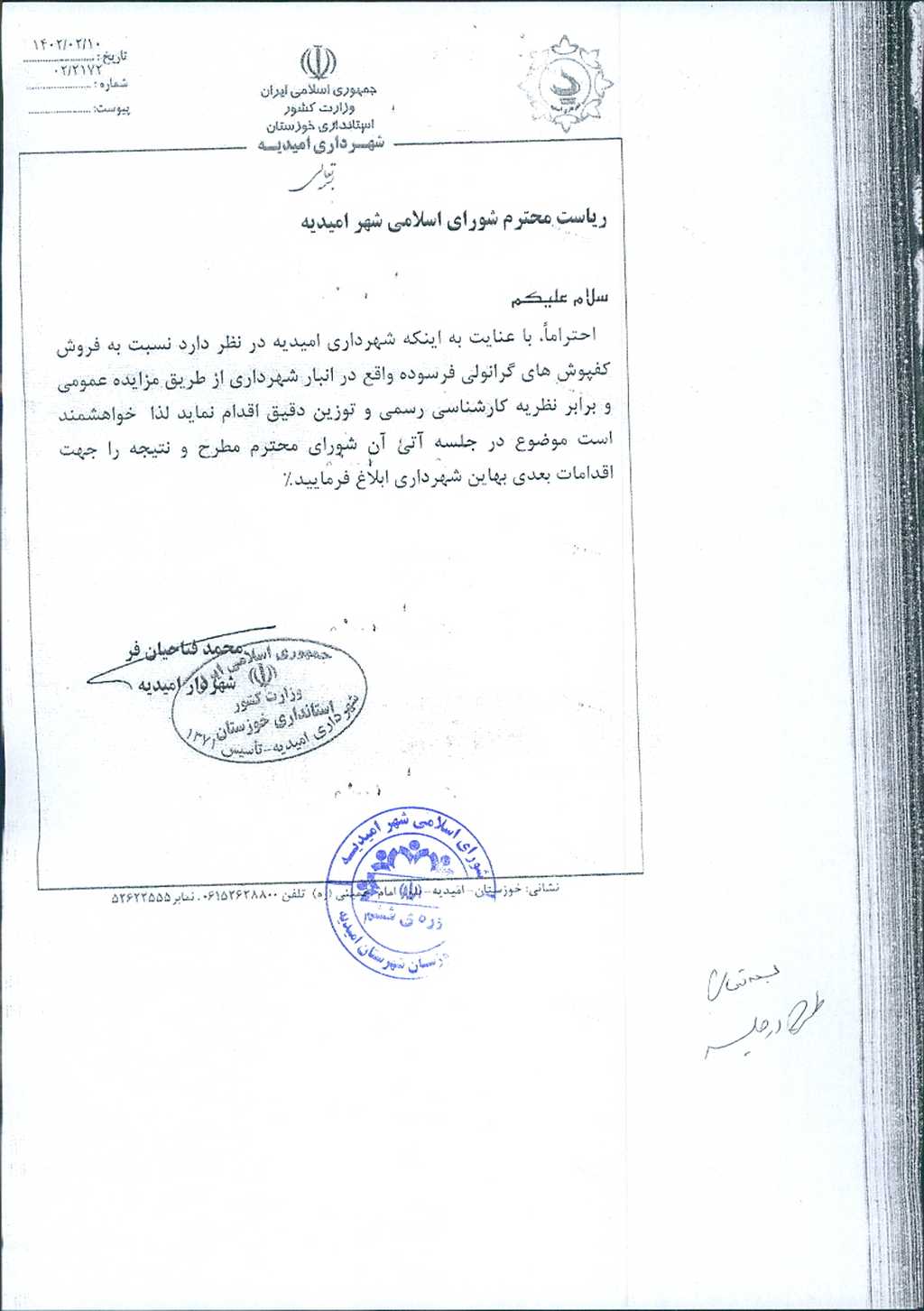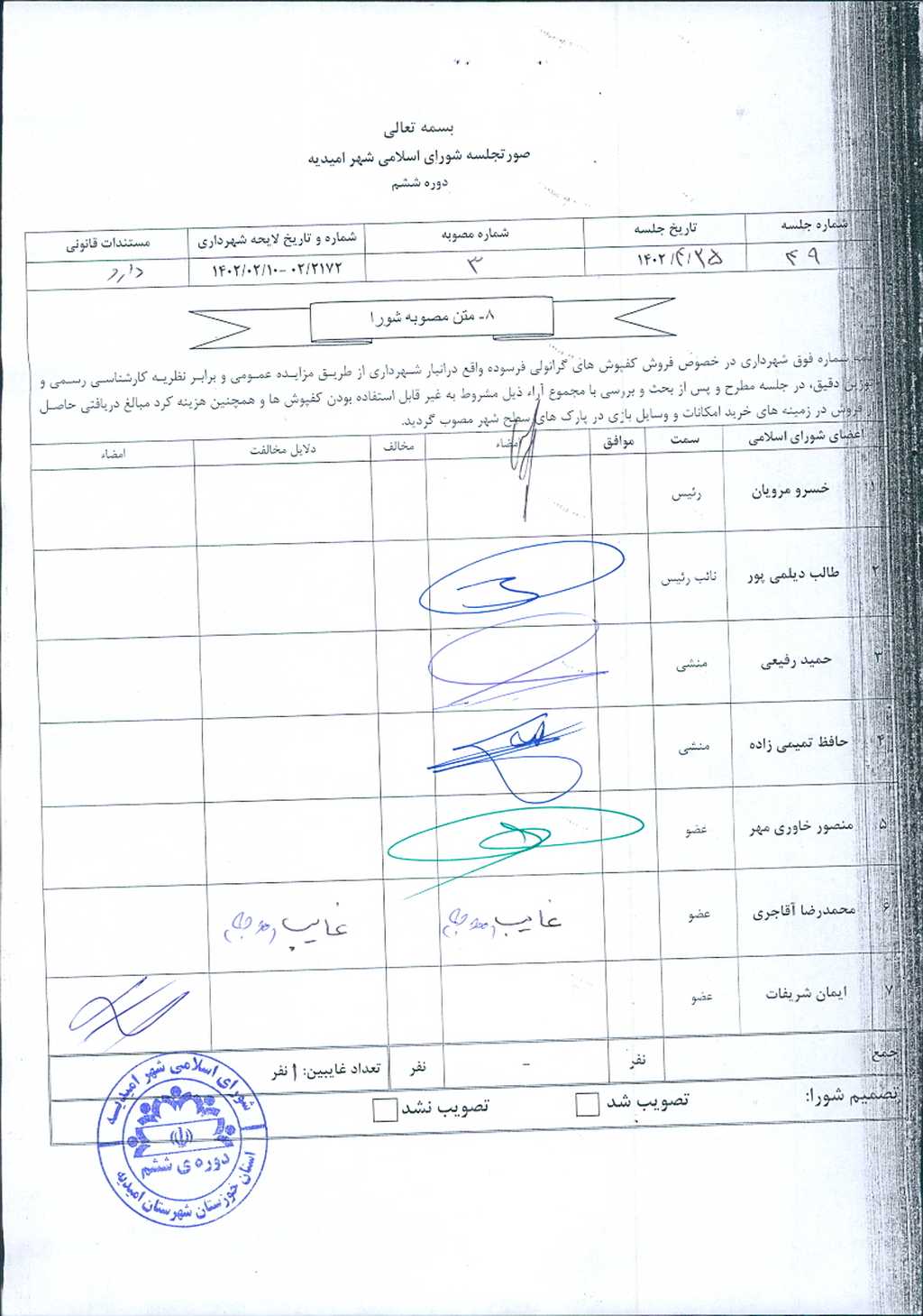 مصوبه شماره ۳ جلسه شماره ۴۹ شورای اسلامی شهر امیدیه