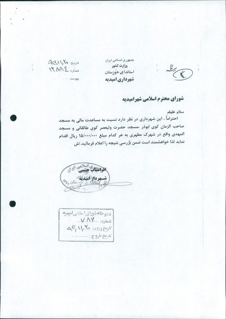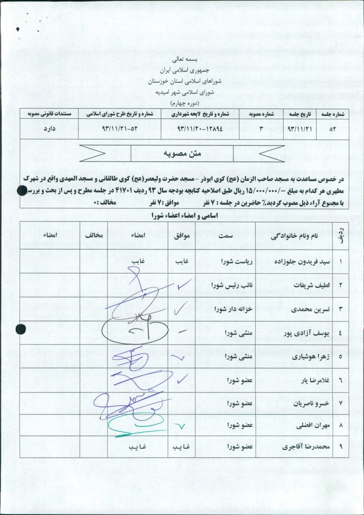 در خصوص مساعدت به مسجد صاحب الزمان (عج) کوی ابوذر – مسجد حضرت ولیعصر(عج) کوی طالقانی و مسجد المهدی واقع در شهرک مطهری هر کدام به مبلغ ۱۵۰۰۰۰۰۰ ریال طبق اصلاحیه کتابچه بودجه سال ۹۳ ردیف ۴۱۷۰۱ در جلسه مطرح و پس از بحث و بررسی با مجموع آراء ذیل مصوب گردید%