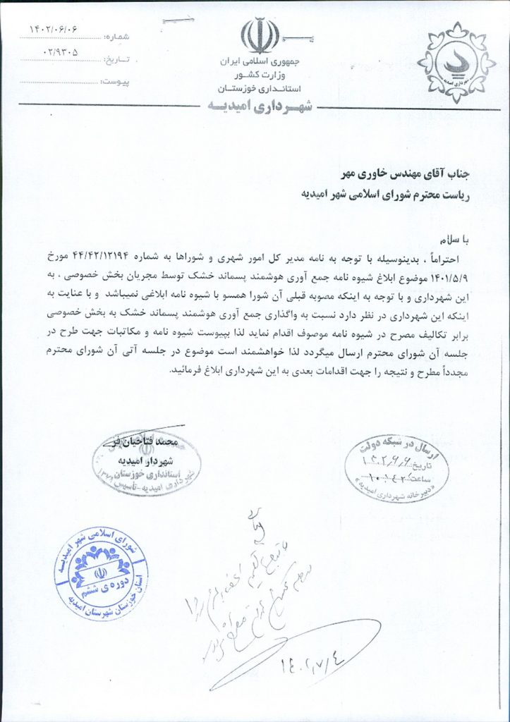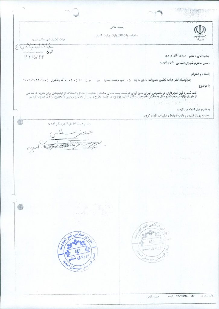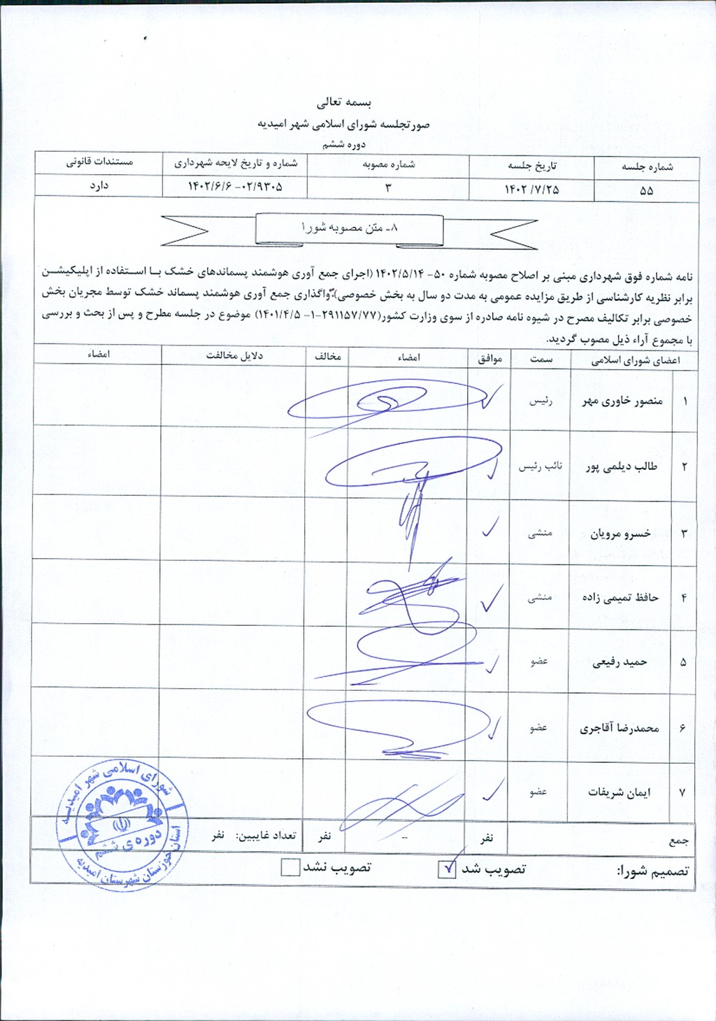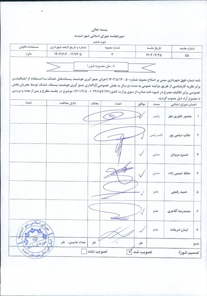 مصوبه شماره ۳ جلسه شماره ۵۵ شورای اسلامی شهر امیدیه