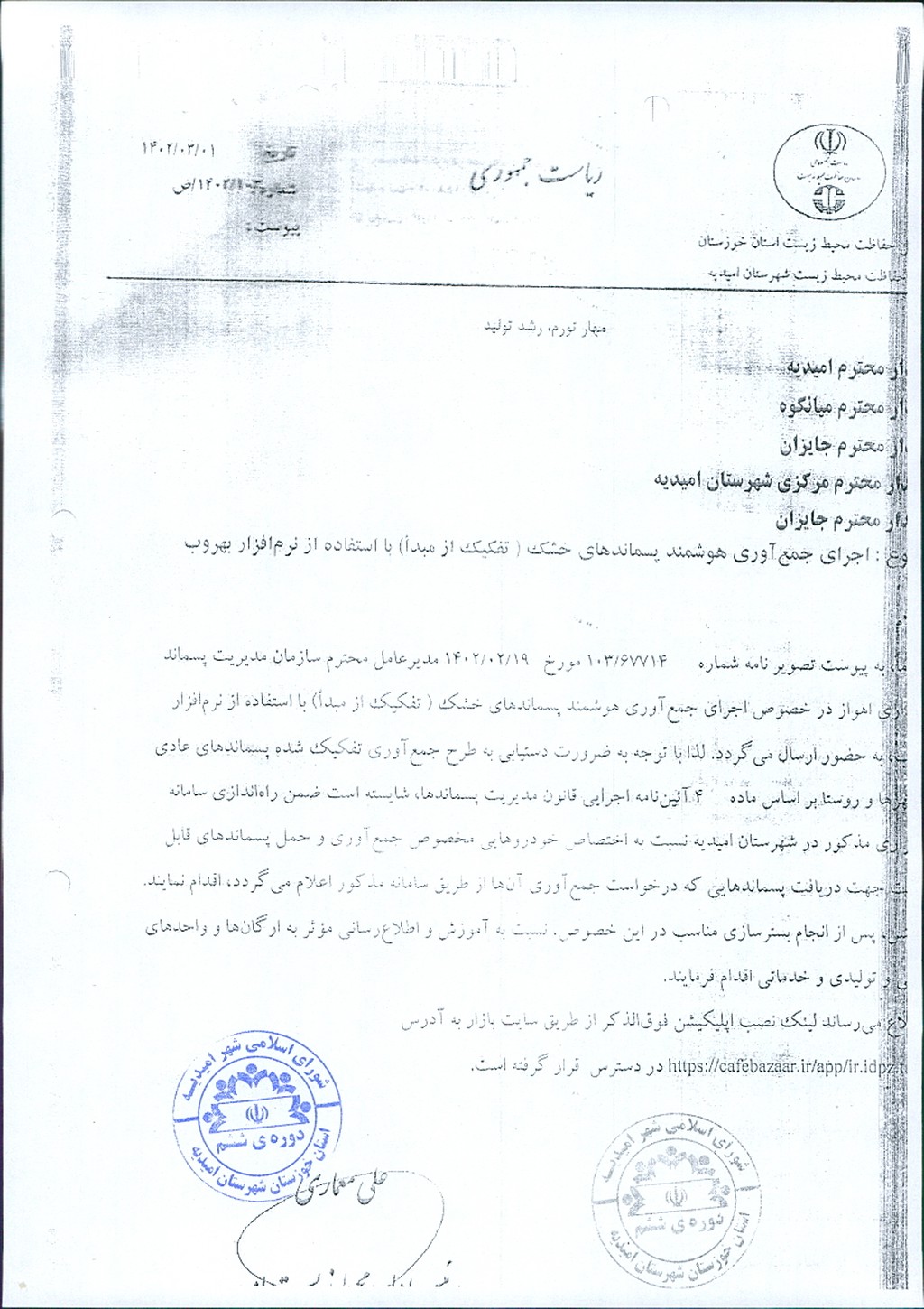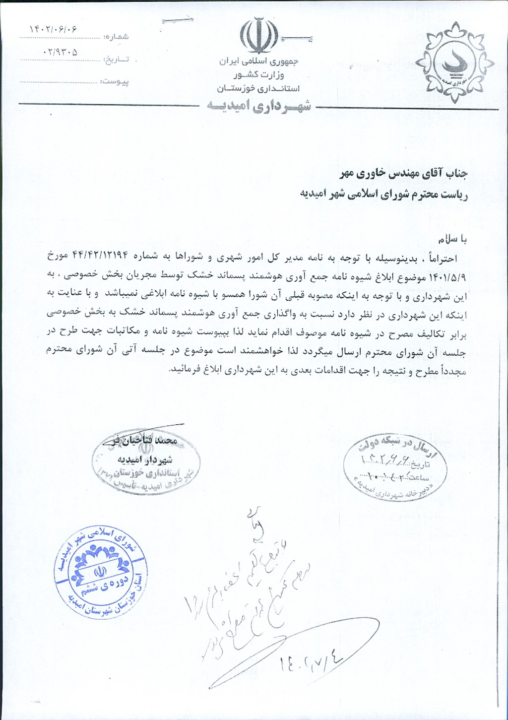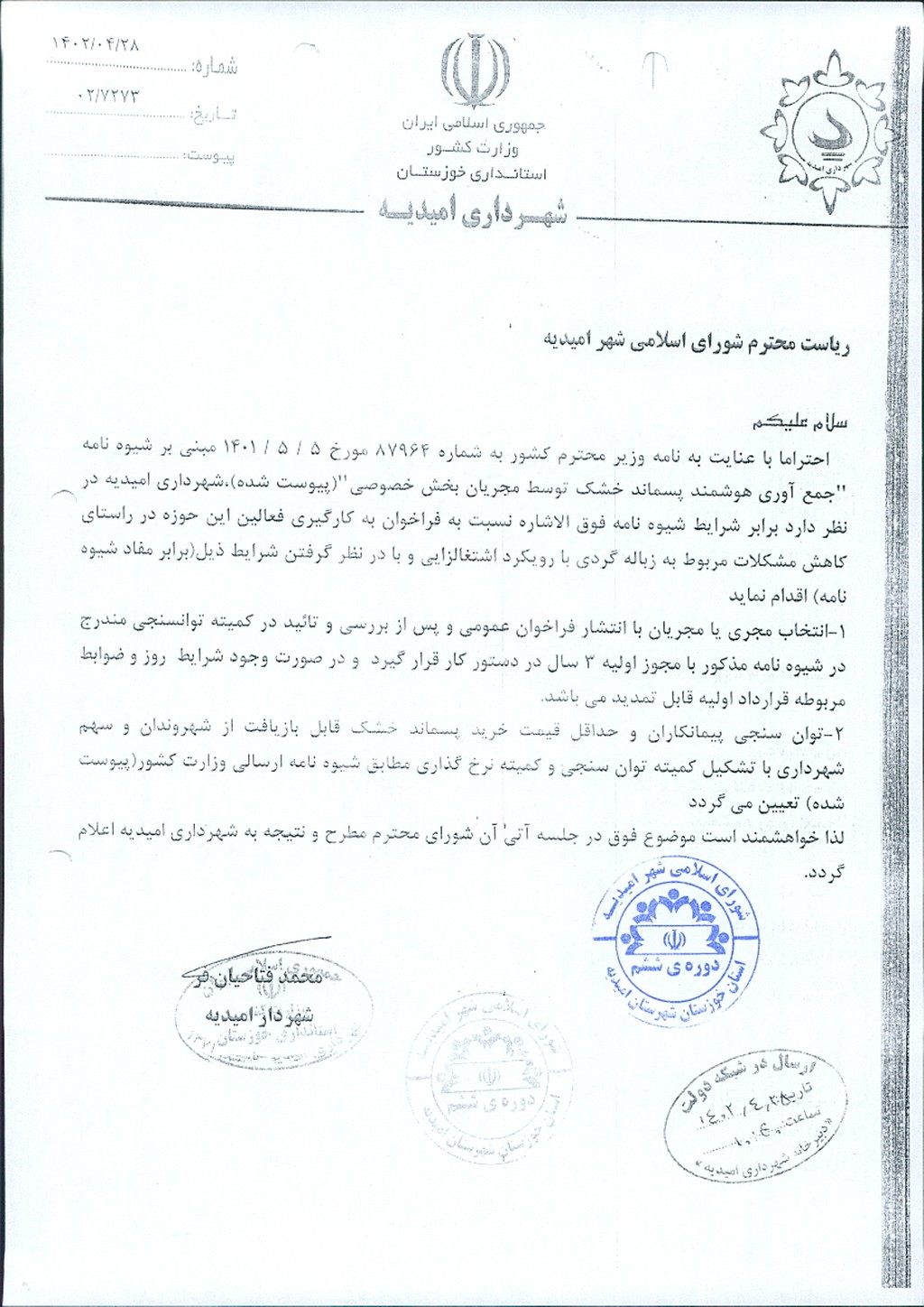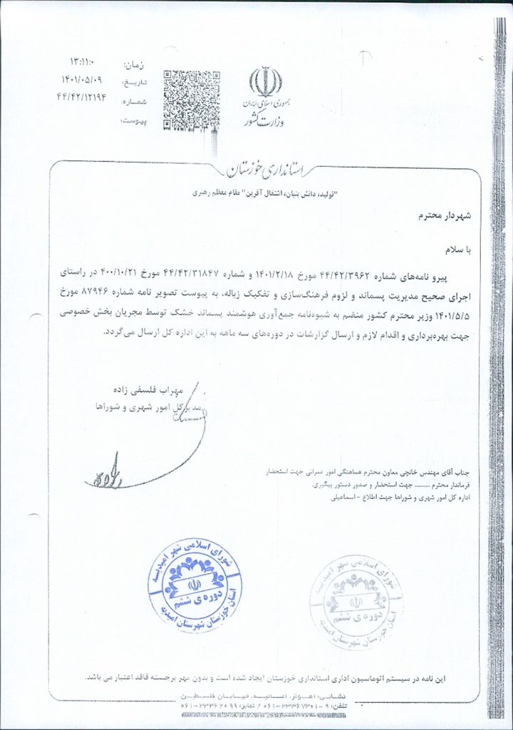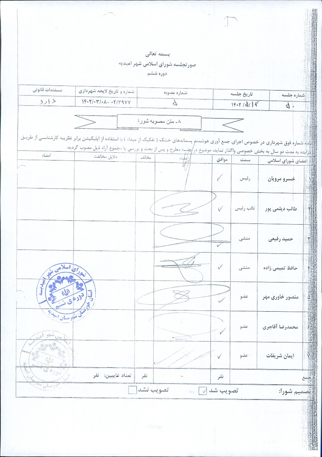 نامه شماره فوق شهرداری مبنی بر اصلاح مصوبه شماره ۵۰- ۱۴/ ۵/ ۱۴۰۲ (اجرای جمع آوری هوشمند پسماندهای خشک با استفاده از اپلیکیشن برابر نظریه کارشناسی از طریق مزایده عمومی به مدت دو سال به بخش خصوصی) به واگذاری جمع آوری هوشمند پسماند خشک توسط مجریان بخش خصوصی برابر تکالیف مصرح در شیوه نامه صادره از سوی وزارت کشور( ۷۷/ ۱-۲۹۱۱۵۷- ۵/ ۴/ ۱۴۰۱) موضوع در جلسه مطرح و پس از بحث و بررسي با مجموع آراء ذيل مصوب گرديد.