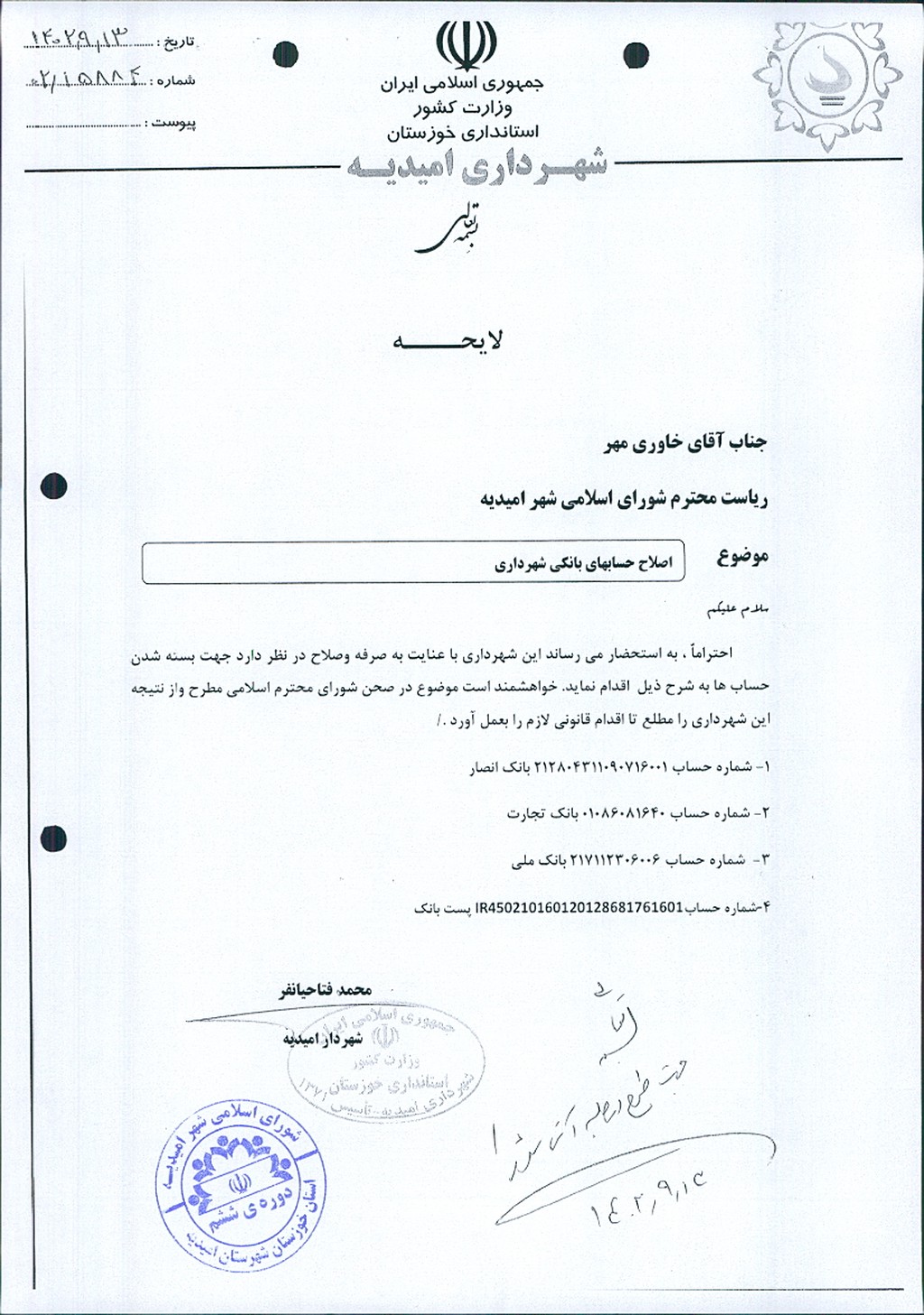 نامه شماره فوق مبنی بر اینکه شهرداری در نظر دارد جهت ایجاد نظم مالی نسبت به بستن حسابهای راکد خود به شرح ذیل اقدام نماید ، موضوع در جلسه مطرح و پس از بحث و بررسي با مجموع آراء ذيل مصوب گرديد.۱-حساب ۲۱۲۸۰۴۳۱۱۰۹۰۷۱۶۰۰۱ بانک انصار ۲- حساب ۰۱۰۸۶۰۸۱۶۴۰ بانک تجارت۳-حساب ۲۱۷۱۱۲۳۰۶۰۰۶ بانک ملی ۴-حساب IR450210160120128681761601 پست بانک