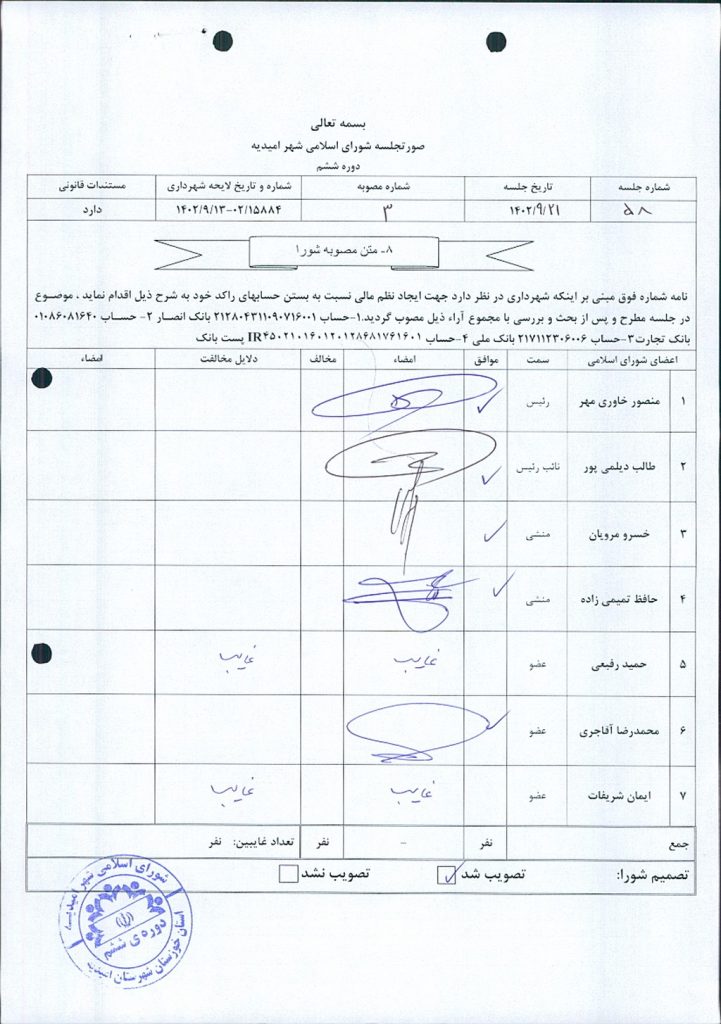 مصوبه شماره ۳ جلسه شماره ۵۸ شورای اسلامی شهر امیدیه