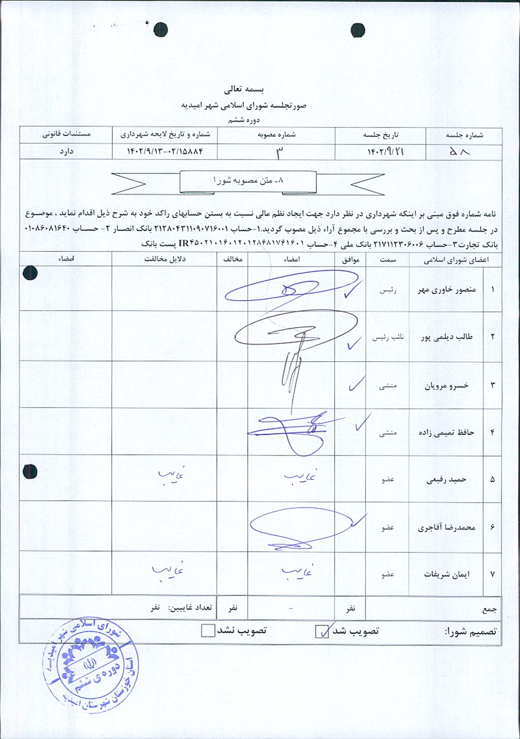 مصوبه شماره ۳ جلسه شماره ۵۸ مورخ ۱۴۰۲/۰۹/۲۱ شورای اسلامی شهر امیدیه