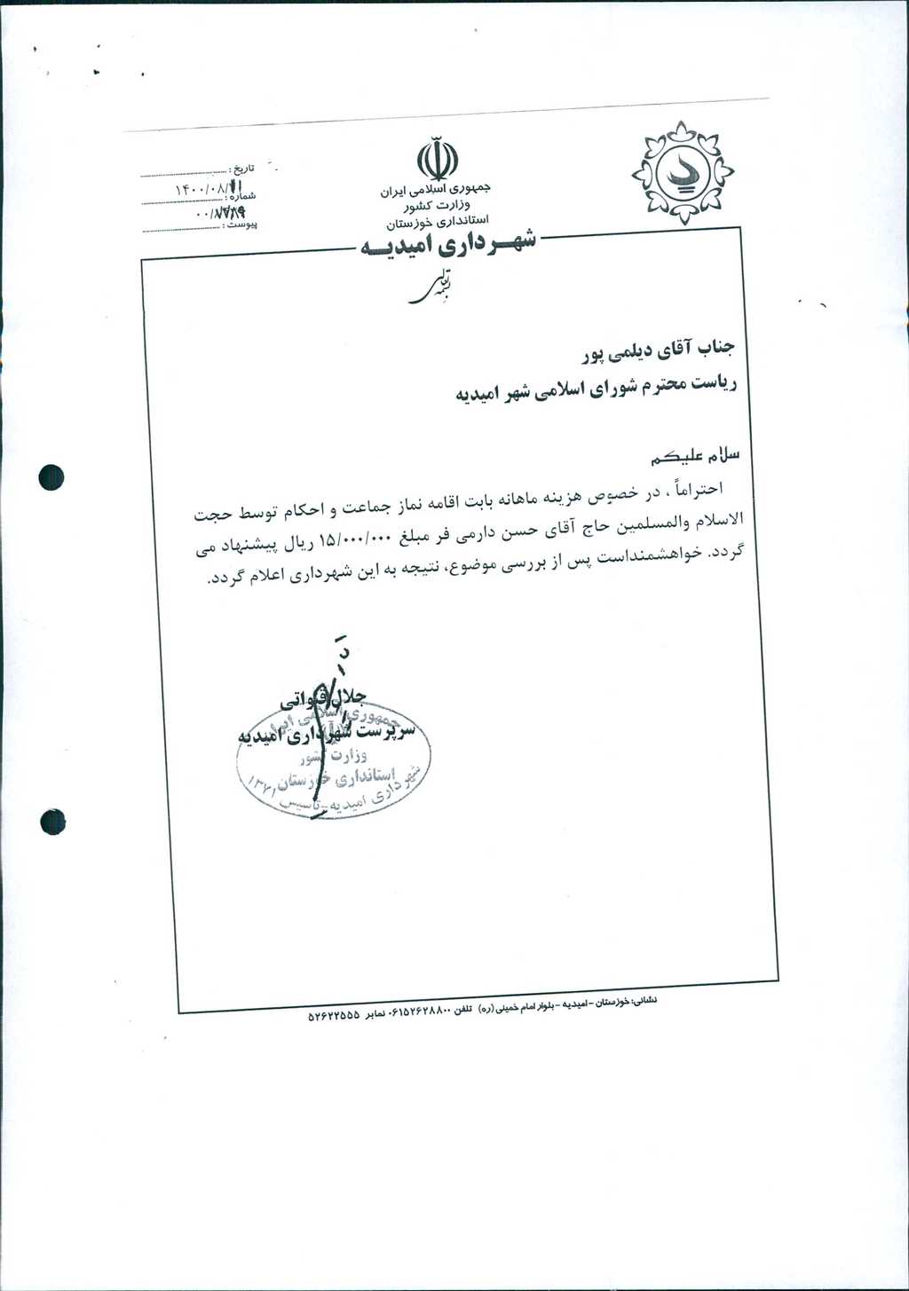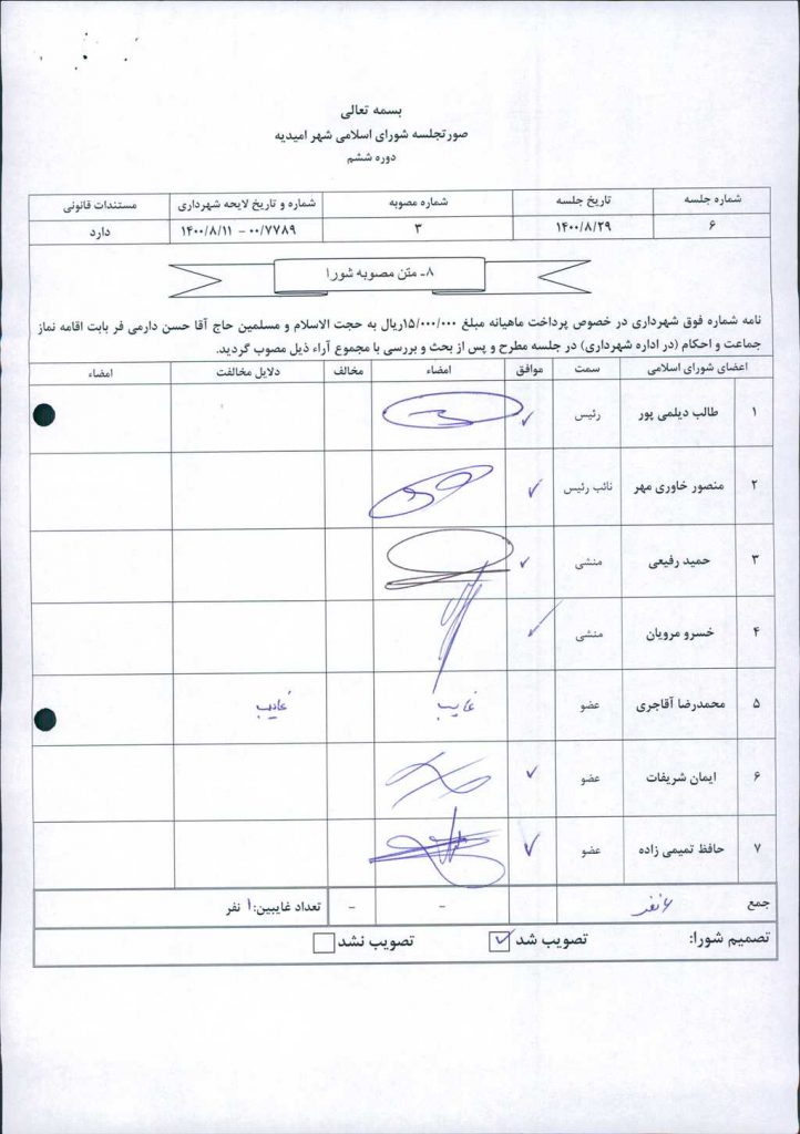 نامه شماره فوق شهرداری در خصوص پرداخت ماهیانه مبلغ ۰۰۰/۰۰۰/ ۱۵ريال به حجت الاسلام و مسلمین حاج آقا حسن دارمی فر بابت اقامه نماز جماعت و احکام (در اداره شهرداری) در جلسه مطرح و پس از بحث و بررسی با مجموع آراء ذیل مصوب گردید.