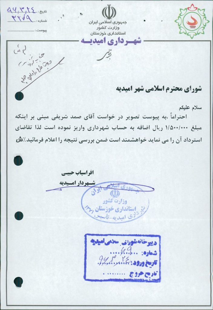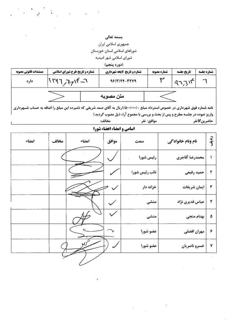مصوبه شماره ۳ جلسه شماره ۶ شورای اسلامی شهر امیدیه