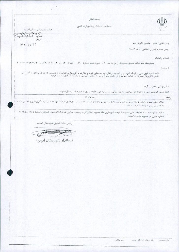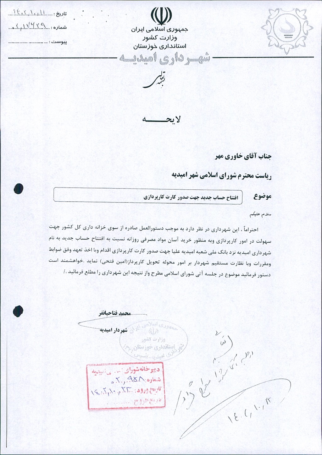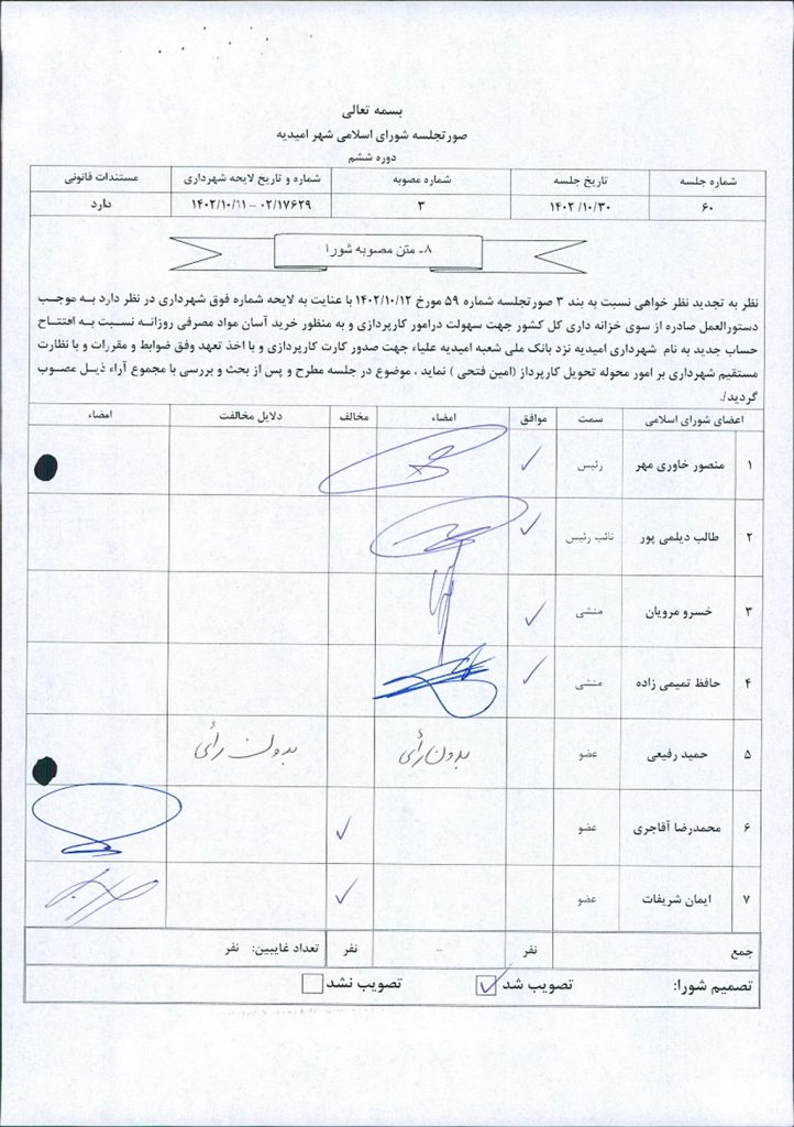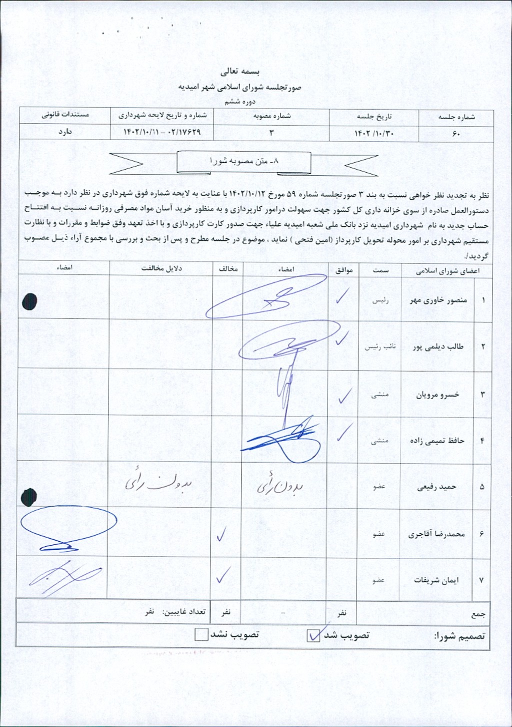 نظر به تجدید نظر خواهی نسبت به بند ۳ صورتجلسه شماره ۵۹ مورخ ۱۲/ ۱۰/ ۱۴۰۲ با عنایت به لایحه شماره فوق شهرداری در نظر دارد به موجب دستورالعمل صادره از سوی خزانه داری کل کشور جهت سهولت درامور کارپردازی و به منظور خرید آسان مواد مصرفی روزانه نسبت به افتتاح حساب جدید به نام شهرداری امیدیه نزد بانک ملی شعبه امیدیه علیاء جهت صدور کارت کارپردازی و با اخذ تعهد وفق ضوابط و مقررات و با نظارت مستقیم شهرداری بر امور محوله تحویل کارپرداز (امین فتحی ) نماید ، موضوع در جلسه مطرح و پس از بحث و بررسی با مجموع آراء ذيل مصوب گرديد/.