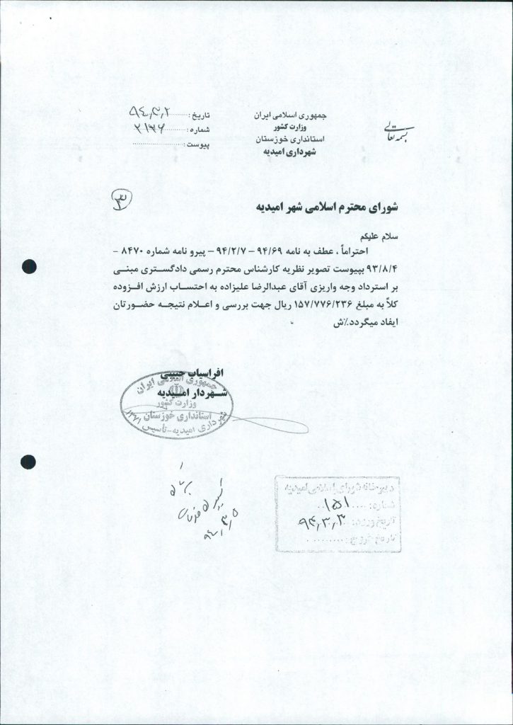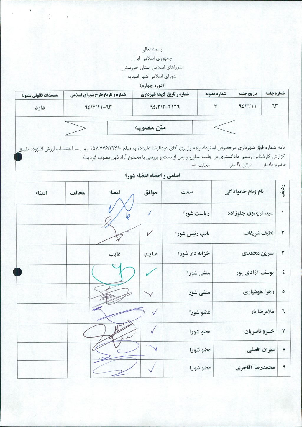مصوبه شماره ۳ جلسه شماره ۶۳ مورخ ۹۴/۳/۱۱ شورای اسلامی شهر امیدیه