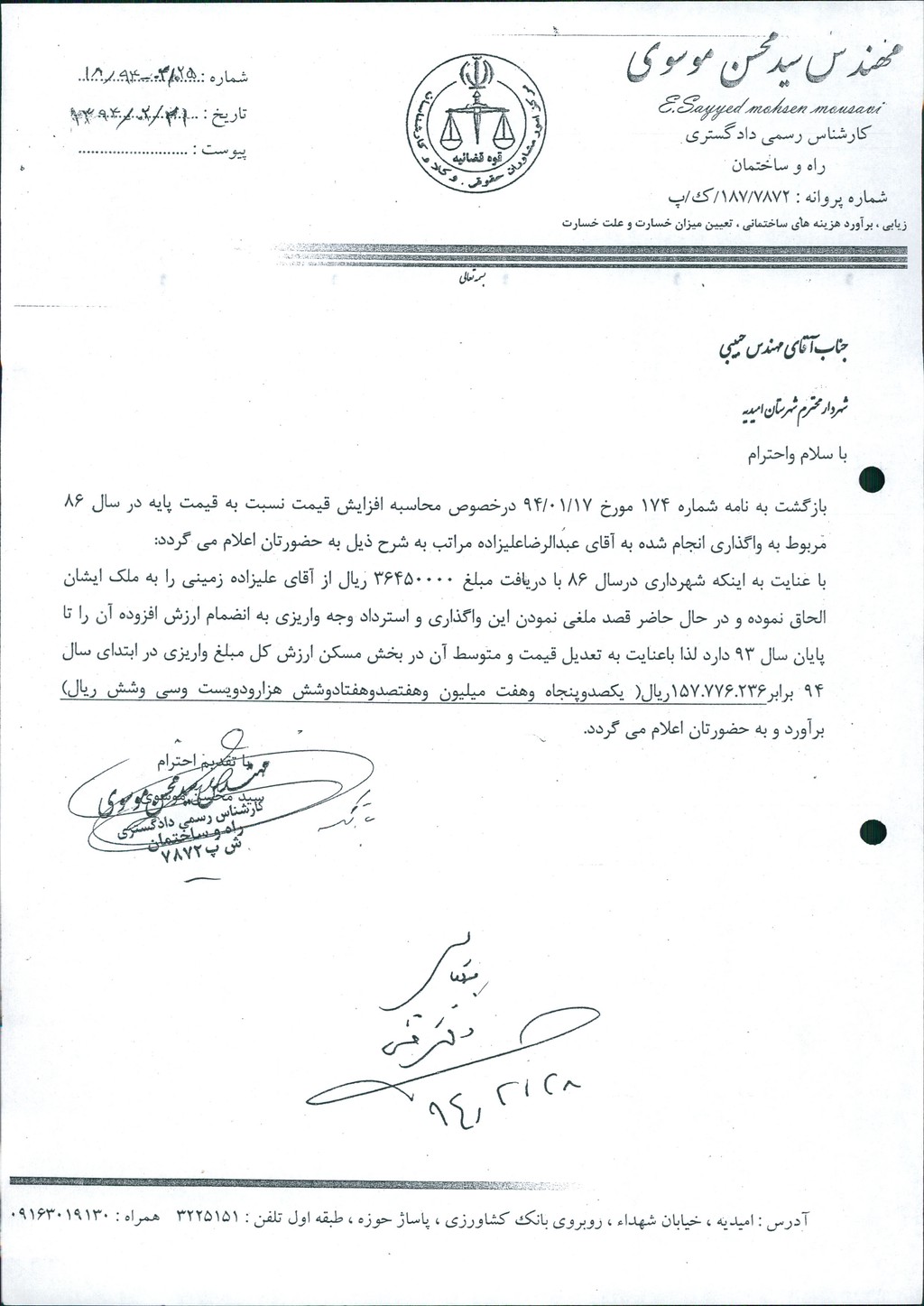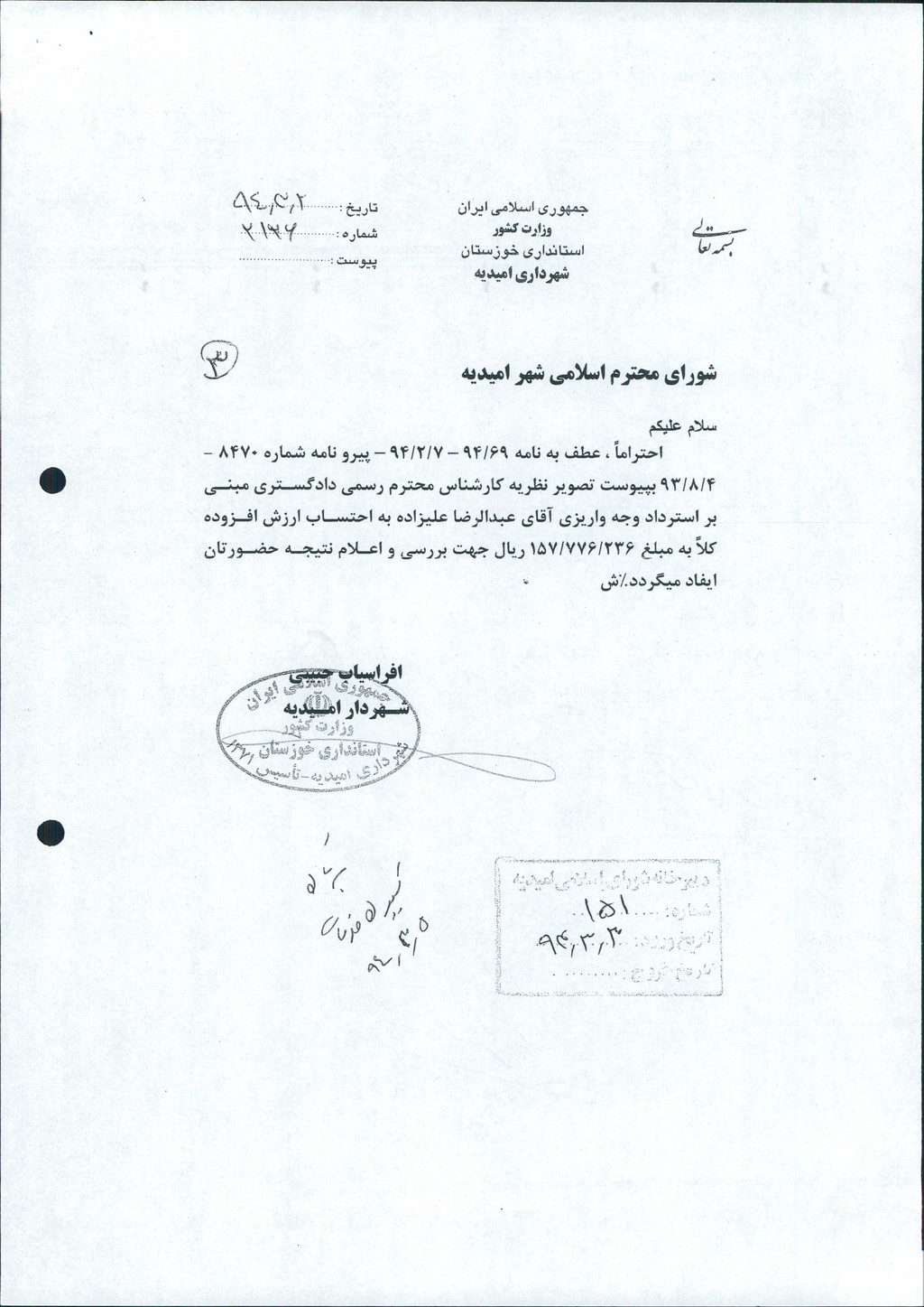 نامه شماره فوق شهرداری درخصوص استرداد وجه واریزی آقای عبدالرضا علیزاده به مبلغ ۱۵۷۷۷۶۲۳۶ ریال با احتساب ارزش افزوده طبق گزارش کارشناس رسمی دادگستری در جلسه مطرح و پس از بحث و بررسی با مجموع آراء ذیل مصوب گردید%
