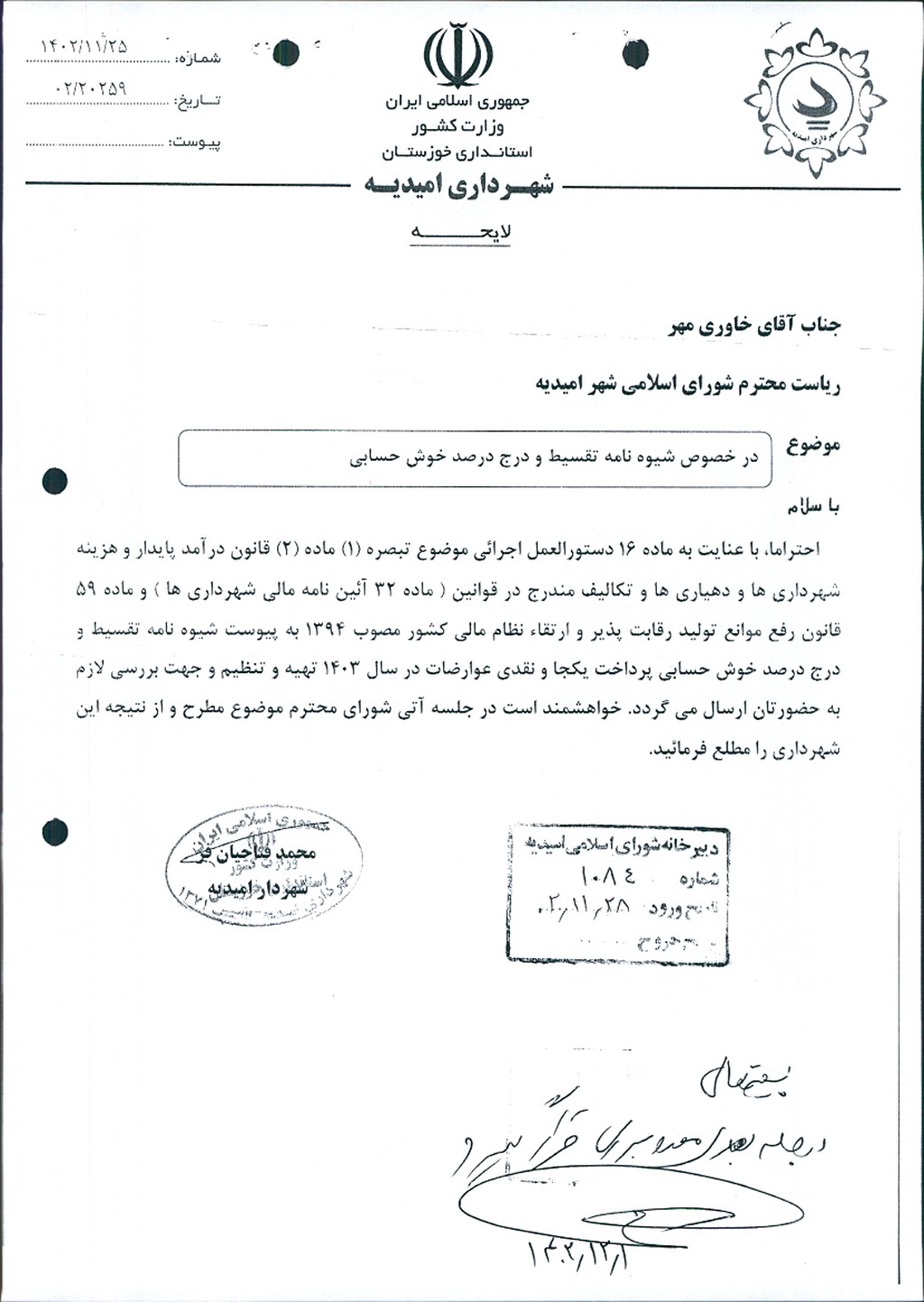 لایحه شماره فوق مبنی بر اینکه شهرداری امیدیه در نظر دارد با عنایت به ماده ۱۶ دستورالعمل اجرایی موضوع تبصره (۱)ماده (۲) قانون درآمد پایدار و هزینه شهرداری ها و دهیاری ها و تکالیف مندرج در قوانین ماده ۳۲ آیین نامه مالی شهرداری ها و ماده ۵۹ قانون رفع موانع تولید رقابت پذیر و ارتقاء نظام مالی کشور مصوب ۱۳۹۴ شیوه نامه تقسیط (طبق لیست پیوست)و درج درصد خوش حسابی پرداخت یکجا و نقدی عوارضات در سال ۱۴۰۳ تنظیم و اجرا نماید ، موضوع در جلسه مطرح و پس از بحث و بررسی با مجموع آراء ذیل مصوب گردید.
