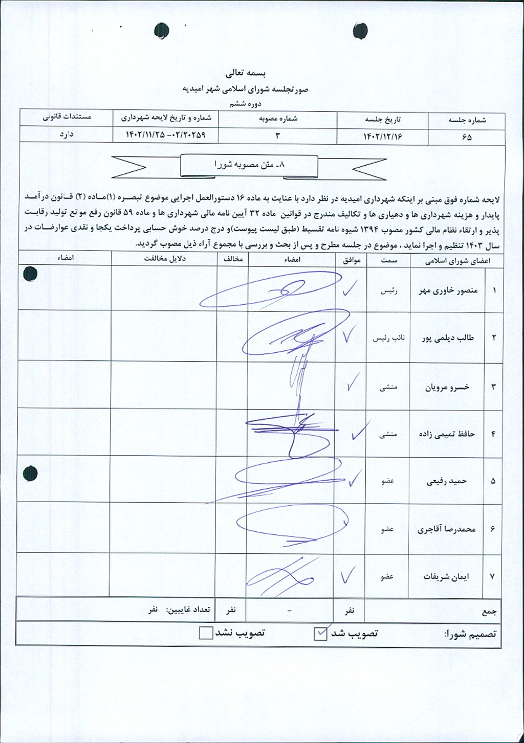 مصوبه شماره ۳ جلسه شماره ۶۵ شورای اسلامی شهر امیدیه
