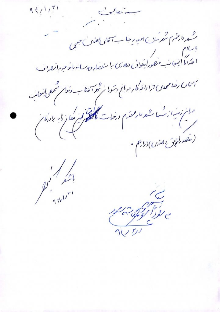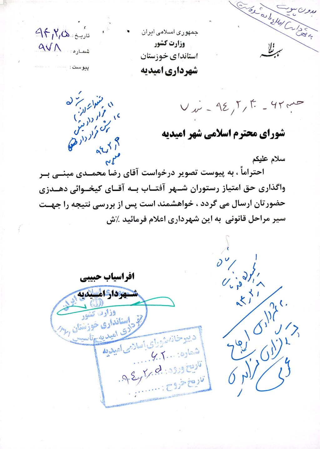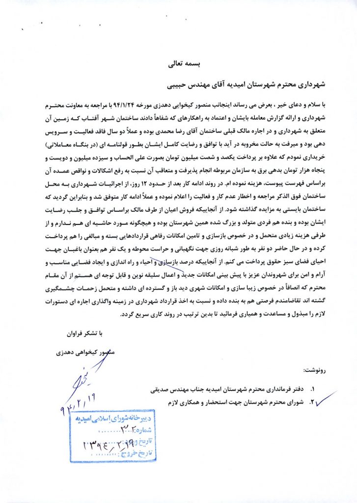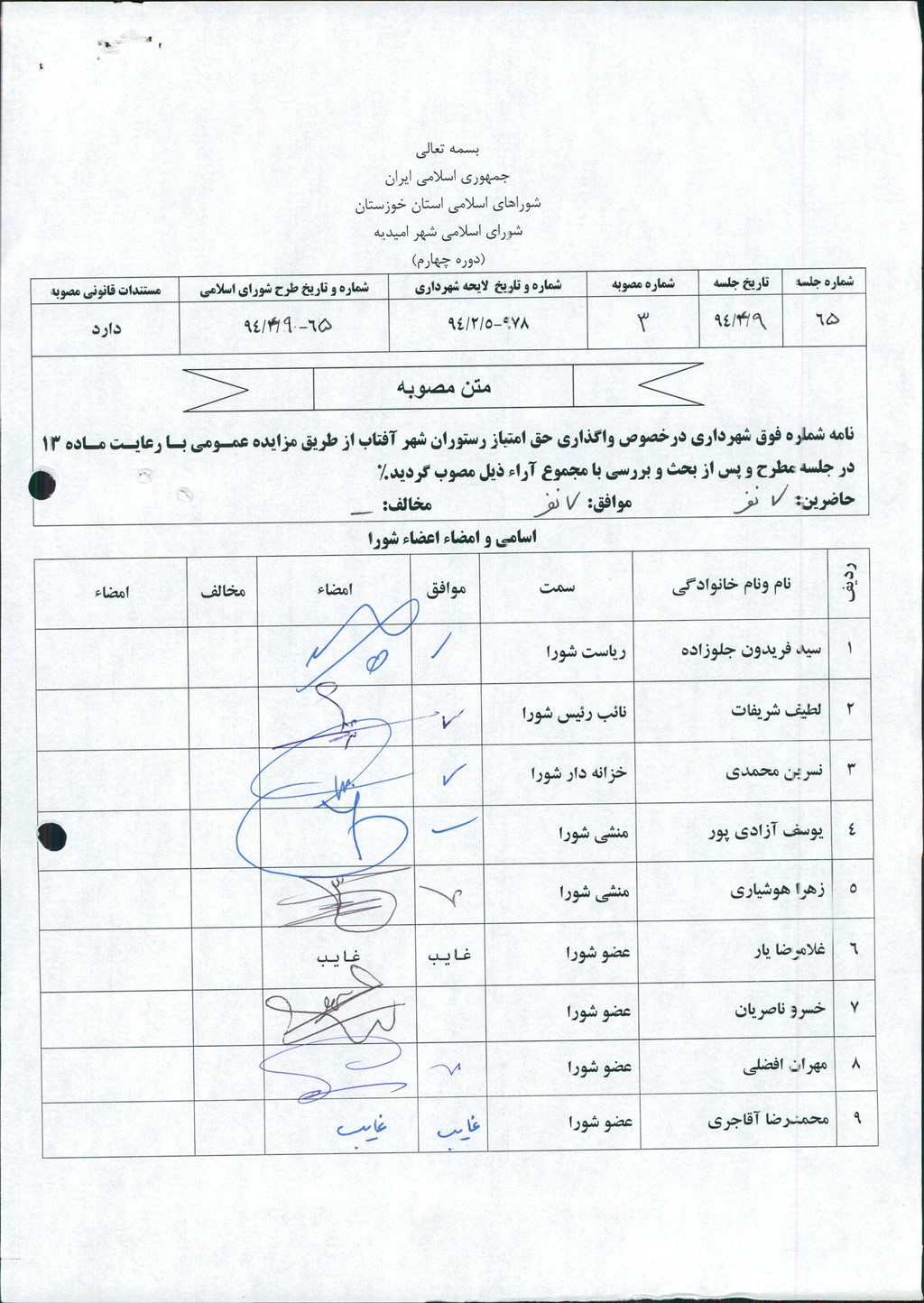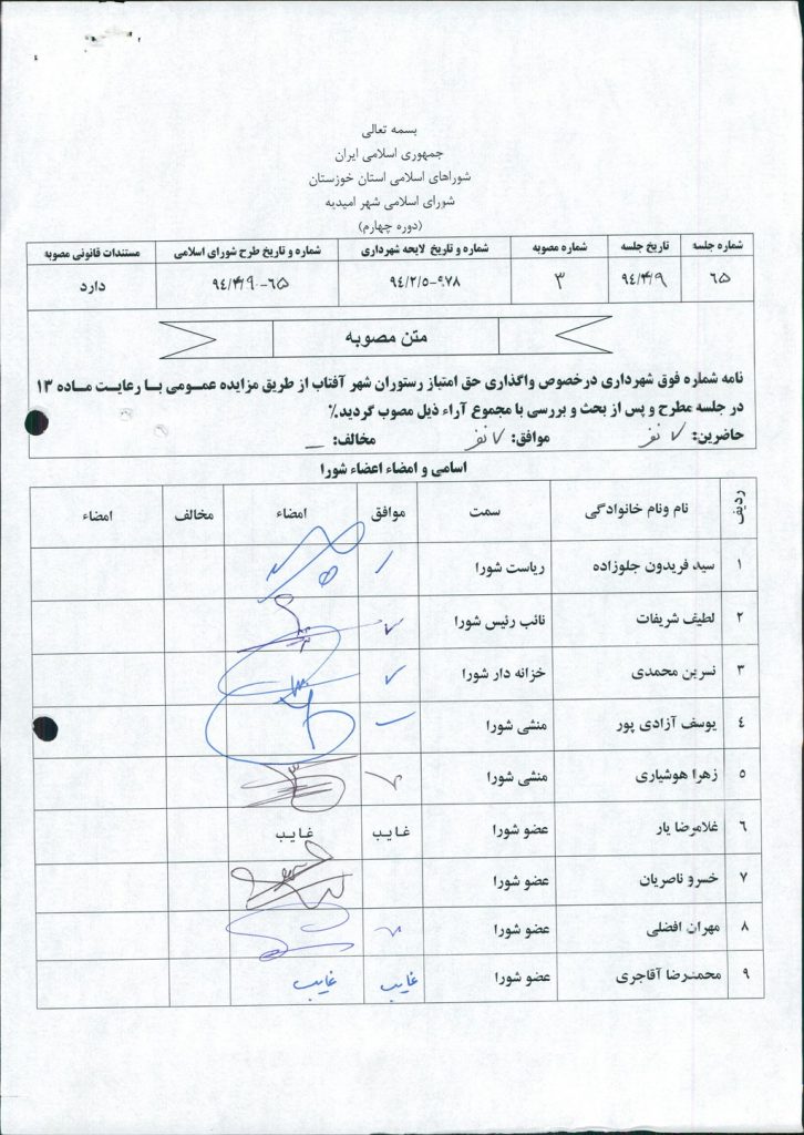 مصوبه شماره ۳ جلسه شماره ۶۵ مورخ ۹۴/۴/۹ شورای اسلامی شهر امیدیه