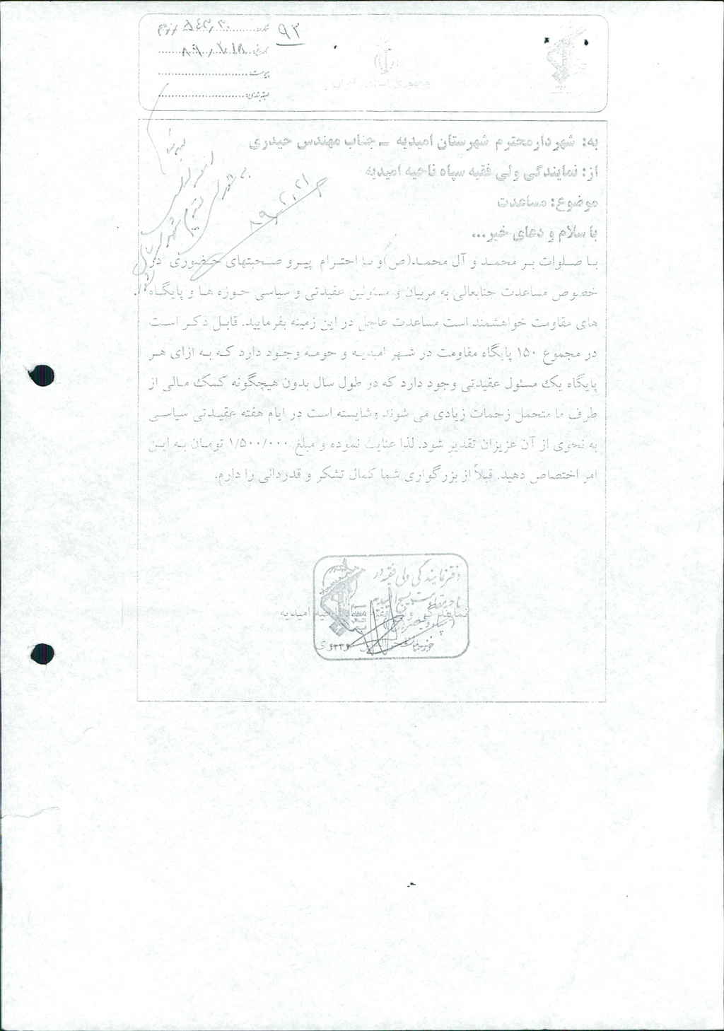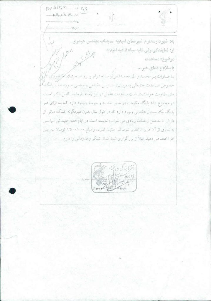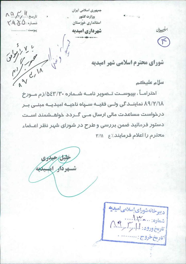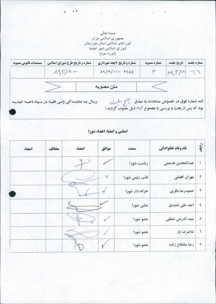 نامه شماره فوق در خصوص مساعدت به مبلغ پنج میلیون ریال به نمایندگی ولی فقیه در سپاه ناحیه امیدیه بود که پس از بحث و بررسی با مجموع آراء ذیل مصوب گردید%