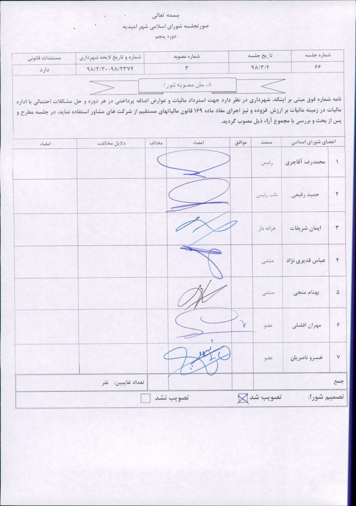 مصوبه شماره ۳ جلسه شماره ۶۶ شورای اسلامی شهر امیدیه