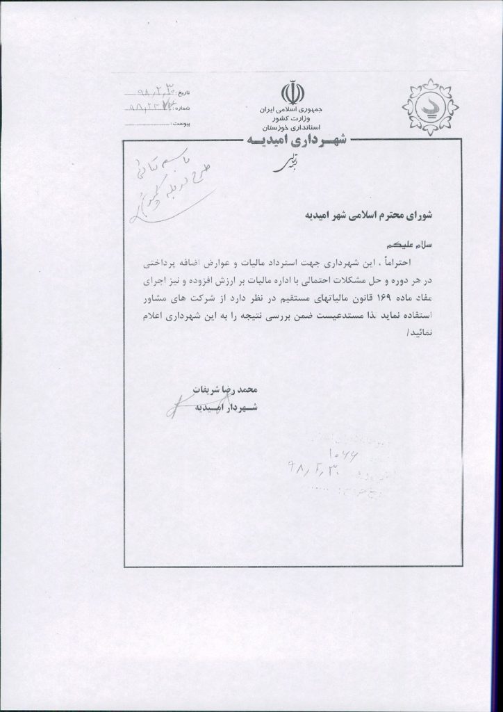 نامه شماره فوق مبنی بر اینکه، شهرداری در نظر دارد جهت استرداد مالیات و عوارض اضافه پرداختی در هر دوره و حل مشکلات احتمالی با اداره مالیات در زمینه مالیات بر ارزش افزوده و نیز اجرای مفاد ماده ۱۶۹ قانون مالیاتهای مستقیم از شرکت های مشاور استفاده نماید، در جلسه مطرح و پس از بحث و بررسی با مجموع آراء ذیل مصوب گردید.