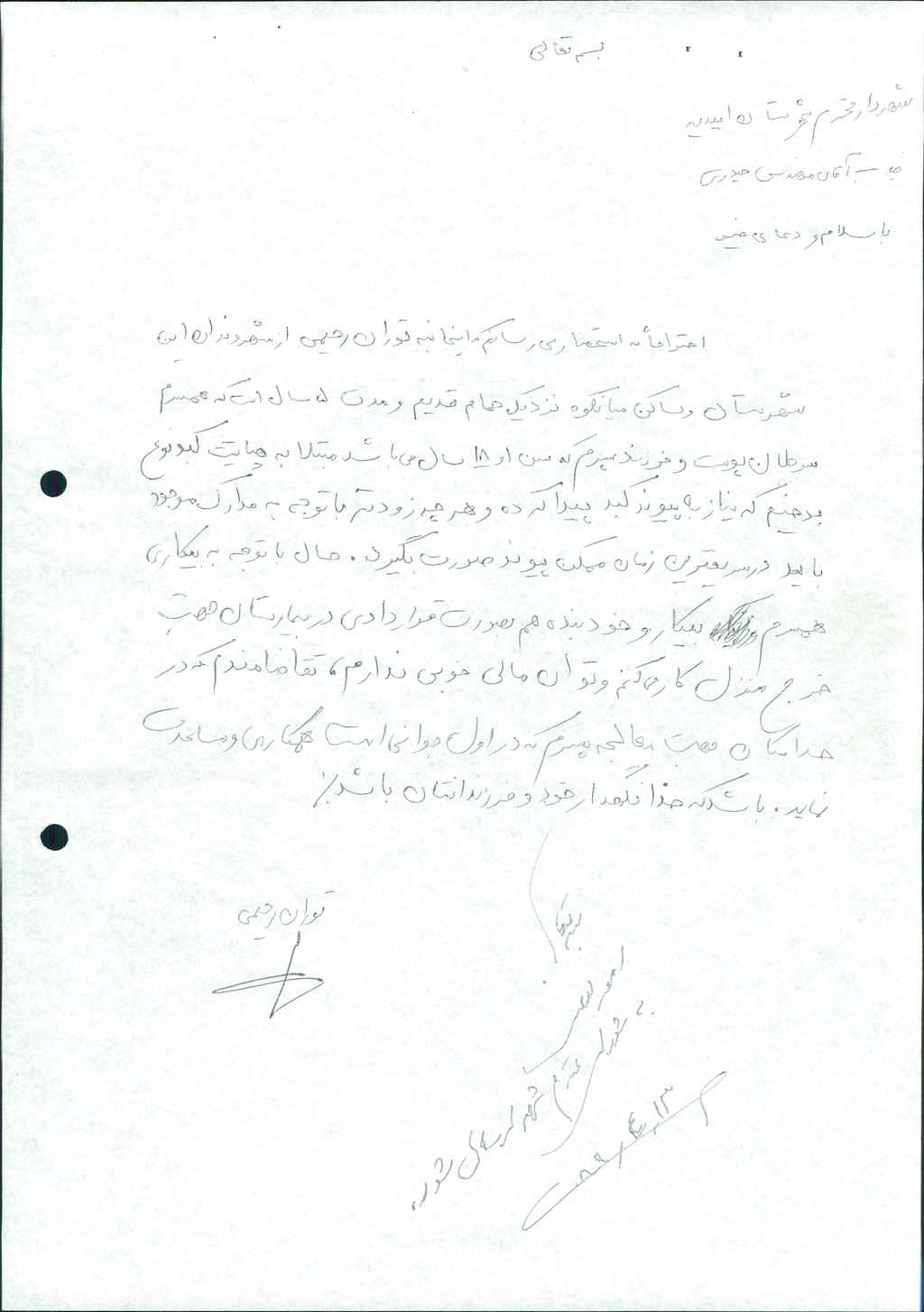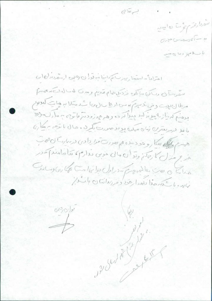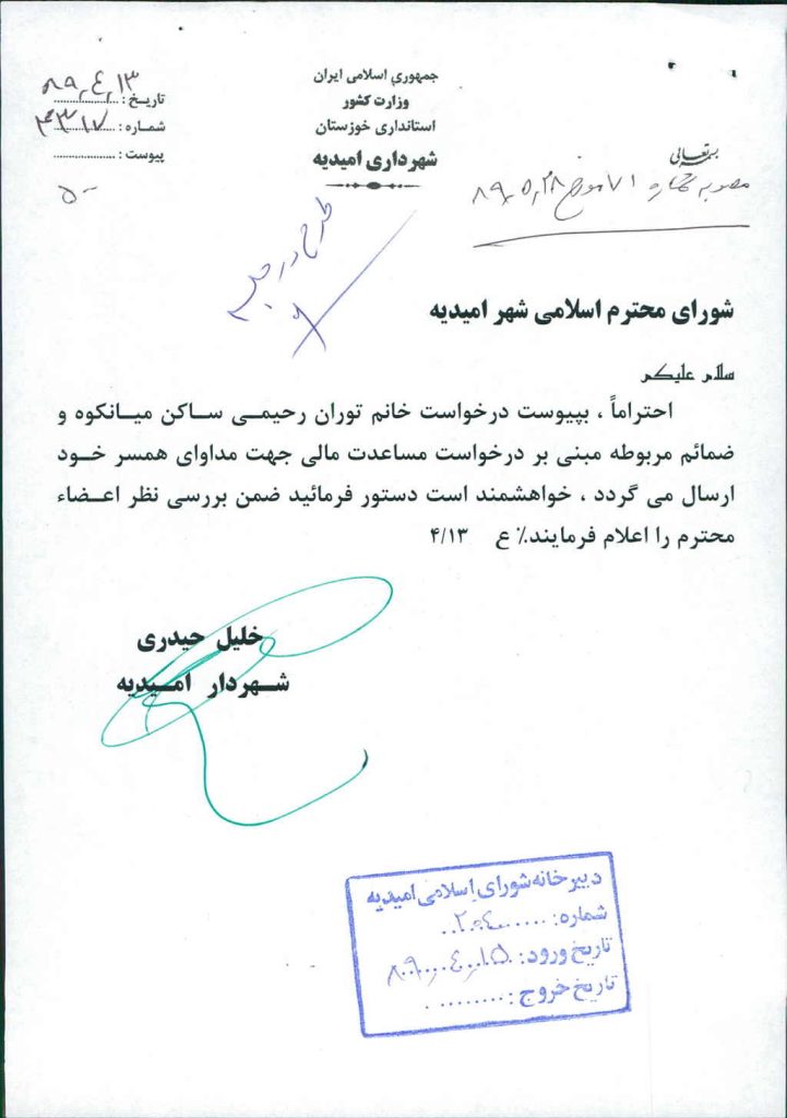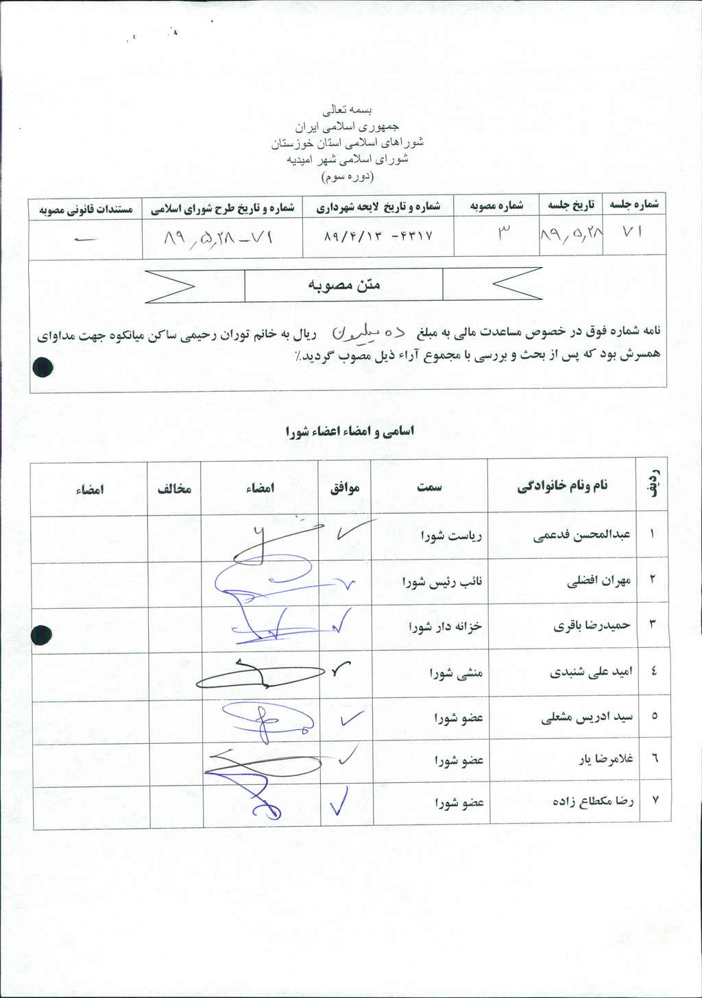 نامه شماره فوق در خصوص مساعدت مالی به مبلغ ده میلیون ریال به خانم توران رحیمی ساکن میانکوه جهت مداوای همسرش بود که پس از بحث و بررسی با مجموع آراء ذیل مصوب گردید%