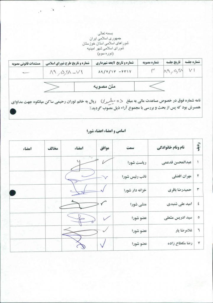 مصوبه شماره ۳ جلسه شماره ۷۱ مورخ ۸۹/۵/۲۸ شورای اسلامی شهر امیدیه
