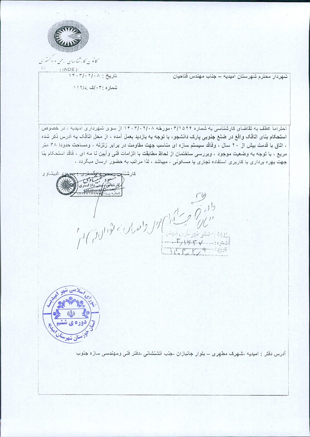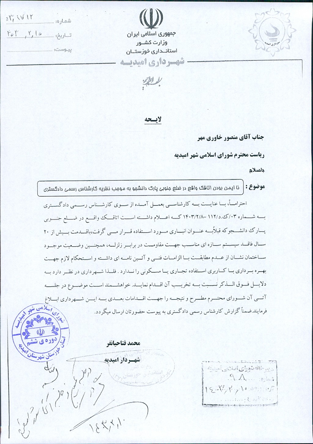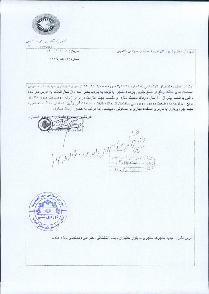 نامه شماره فوق مبنی بر اینکه شهرداری امیدیه در نظر دارد به دلایل ذکر شده در نظریه کارشناس رسمی دادگستری به شماره۰۳/ک.د/۱۱۲مورخ۸/ ۲/ ۱۴۰۳که اعلام داشته است اتاقک واقع در ضلع جنوبی پارک دانشجو که قبلاً به عنوان انباری مورد استفاده قرار می گرفت، با قدمت بیش از۲۰سال و فاقد سیستم سازه ای مناسب جهت مقاومت در برابر زلزله، همچنین وضعیت موجود ساختمان نشان از عدم مطابقت با الزامات فنی و آئین نامه ای داشته و استحکام لازم جهت بهره برداری با کاربری استفاده تجاری یا مسکونی را ندارد، نسبت به تخریب آن اقدام نماید. موضوع در جلسه مطرح و با توجه به بحث وبررسی آن در کمیسیون با مجموع آراء ذیل مشروط به احداث وتجدید بنا در مکان فعلی ضمیمه فرهنگسرا گردد، مصوب گردید.