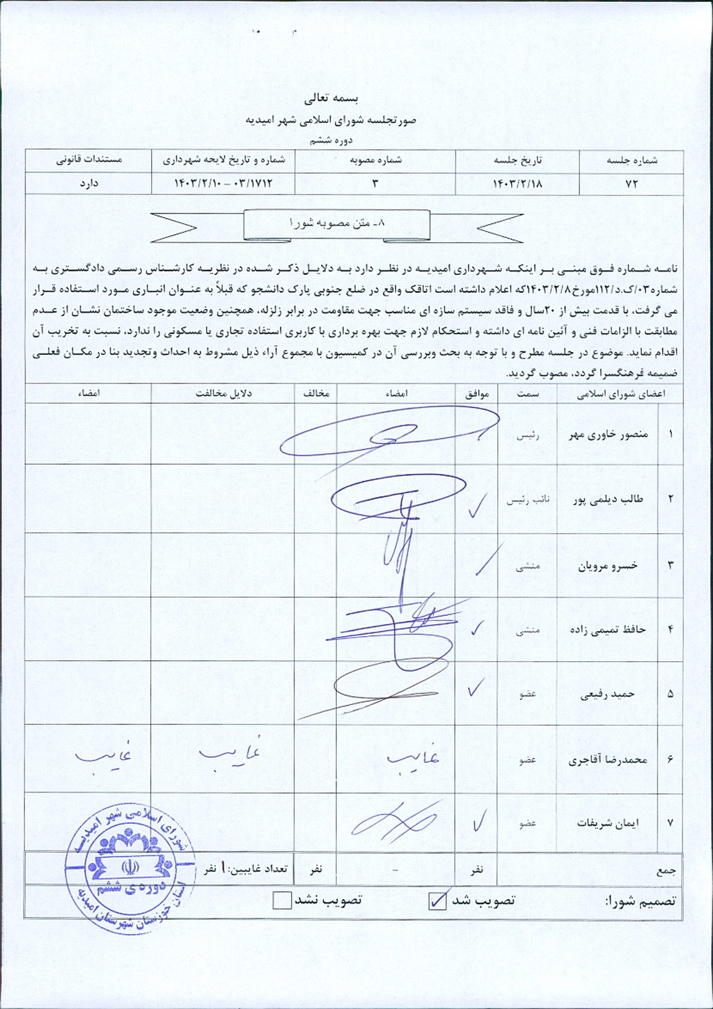 مصوبه شماره ۳ جلسه شماره ۷۲ شورای اسلامی شهر امیدیه