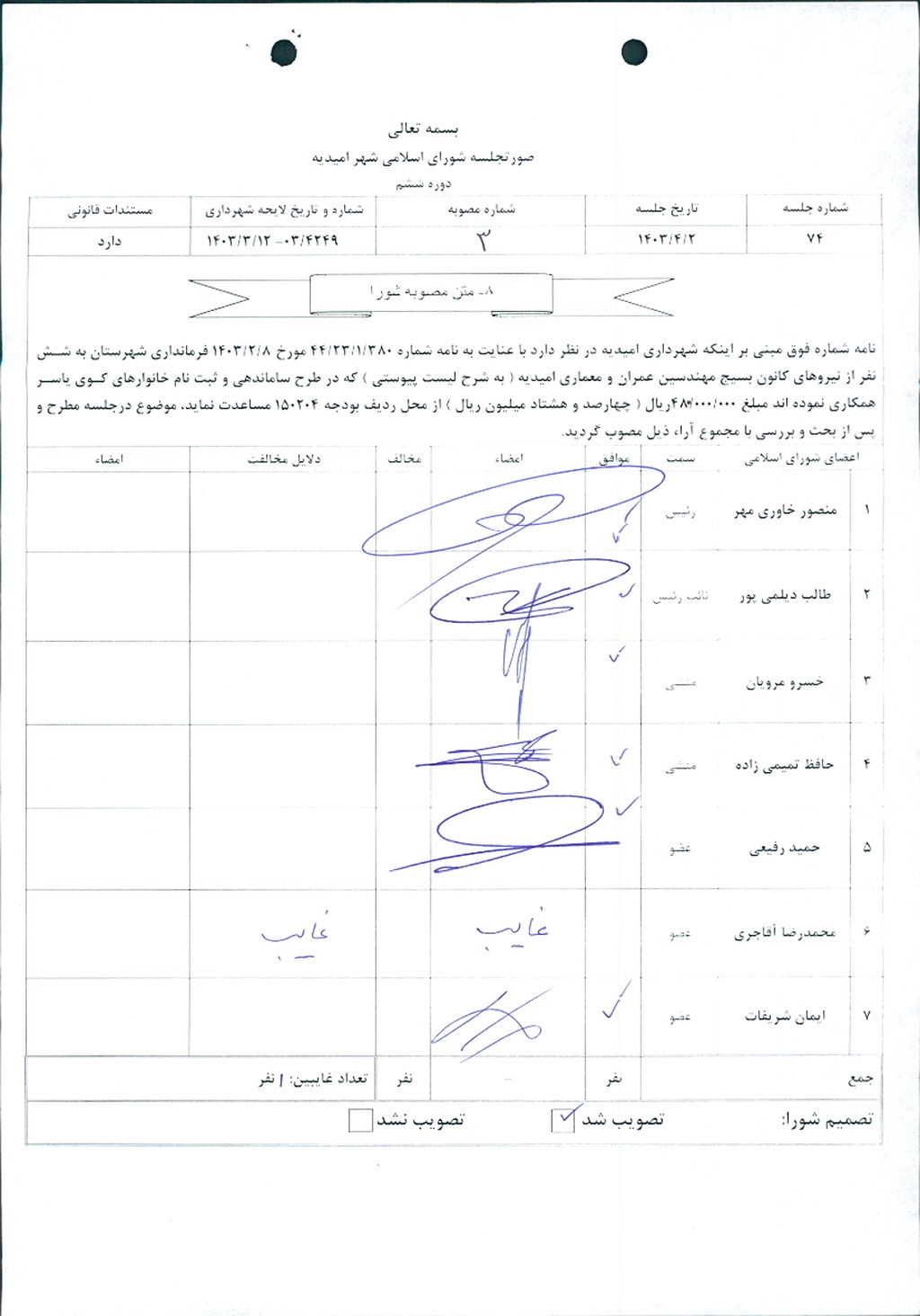 مصوبه شماره ۳ جلسه شماره ۷۴ شورای اسلامی شهر امیدیه