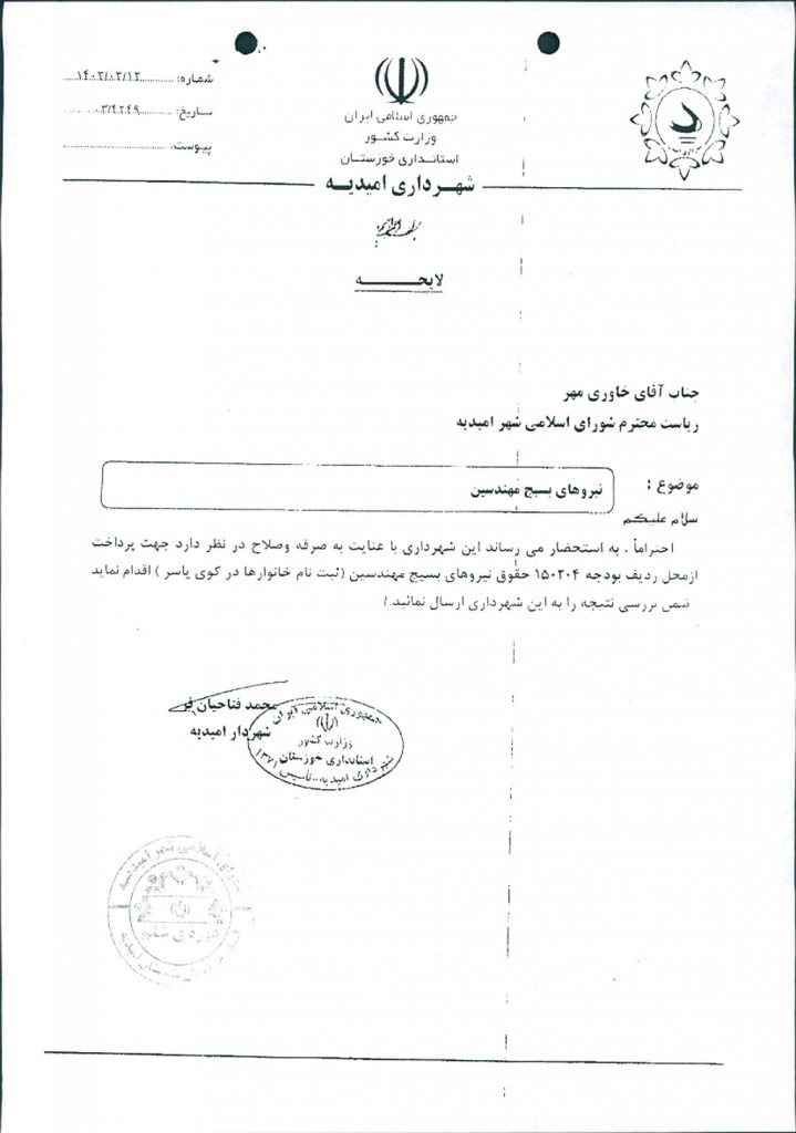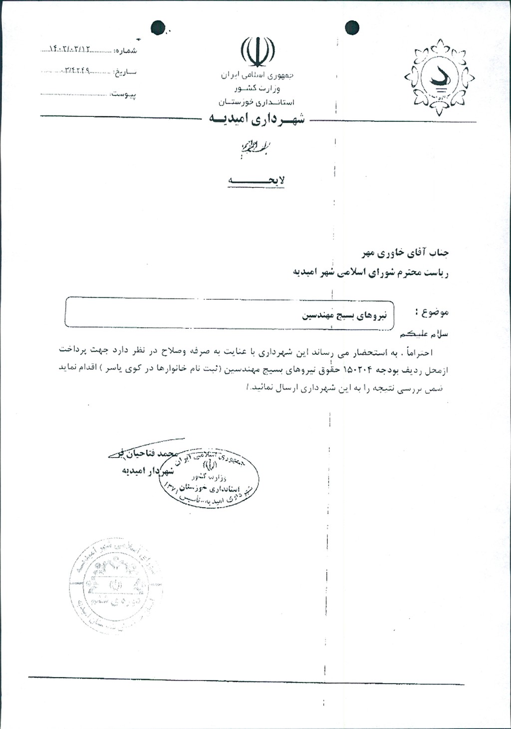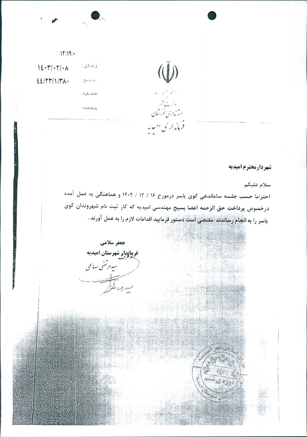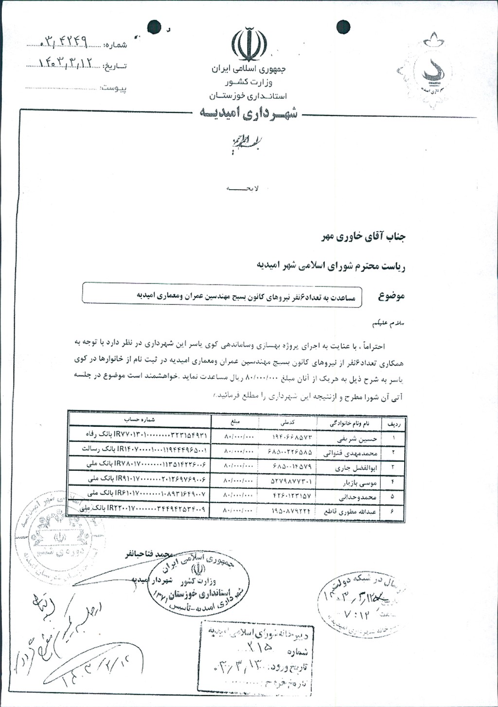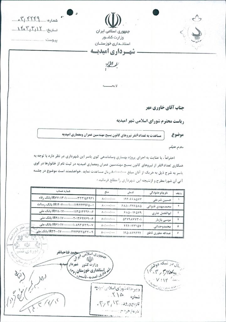 نامه شماره فوق مبنی بر اینکه شهرداري امیدیه در نظر دارد با عنایت به نامه شماره ۳۸۰/ ۱/ ۲۳/ ۴۴ مورخ ۸/ ۲/ ۱۴۰۳ فرمانداری شهرستان به شش نفر از نیروهای کانون بسیج مهندسین عمران و معماری امیدیه (به شرح لیست پیوستی)که در طرح ساماندهی و ثبت نام خانوارهای کوی یاسر همکاری نموده اند مبلغ ۰۰۰/۰۰۰/ ۴۸۰ریال(چهارصد و هشتاد میلیون ریال)از محل ردیف بودجه ۱۵۰۲۰۴ مساعدت نماید، موضوع درجلسه مطرح و پس از بحث و بررسي با مجموع آراء ذيل مصوب گرديد.