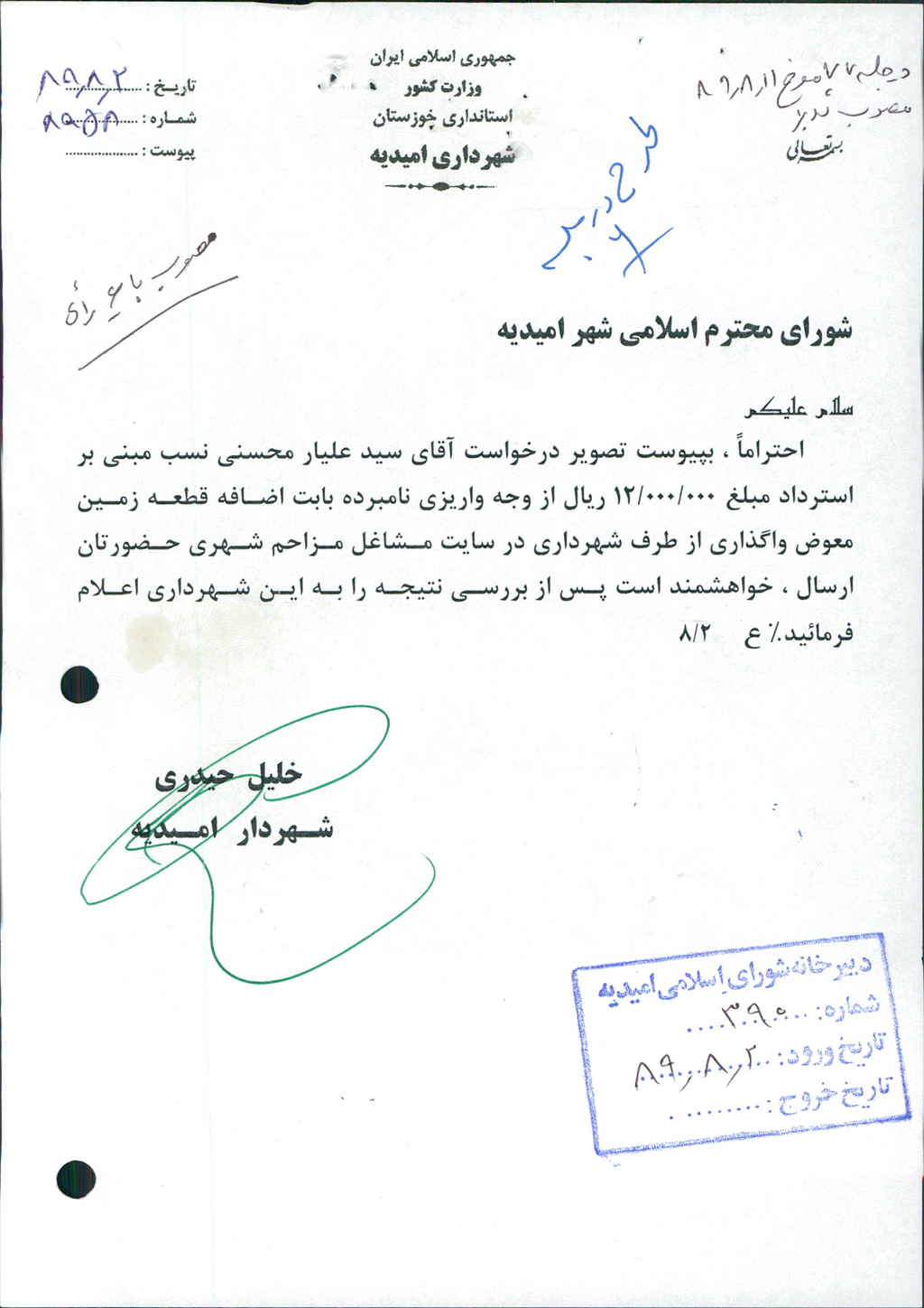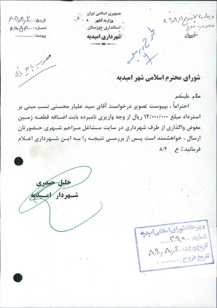 نامه شماره فوق در خصوص درخواست آقای سید علیار محسنی نسب مبنی بر استرداد مبلغ ۱۲/۰۰۰/۰۰۰ ريال از وجه واریزی نامبرده بابت اضافه قطعه زمین معوض واگذاری از طرف شهرداری درسایت مشاغل مزاحم شهری بود که پس از بحث و بررسی با مجموع آراء ذیل مصوب گردید%