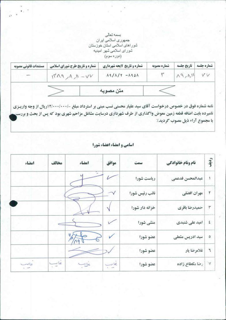 مصوبه شماره ۳ جلسه شماره ۷۷ شورای اسلامی شهر امیدیه