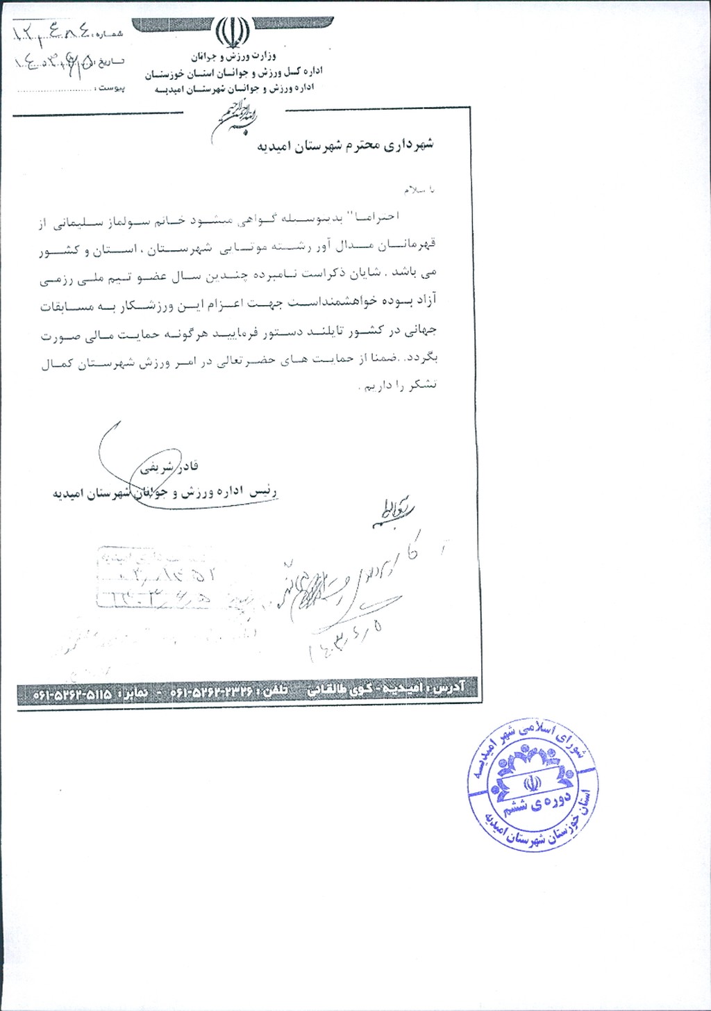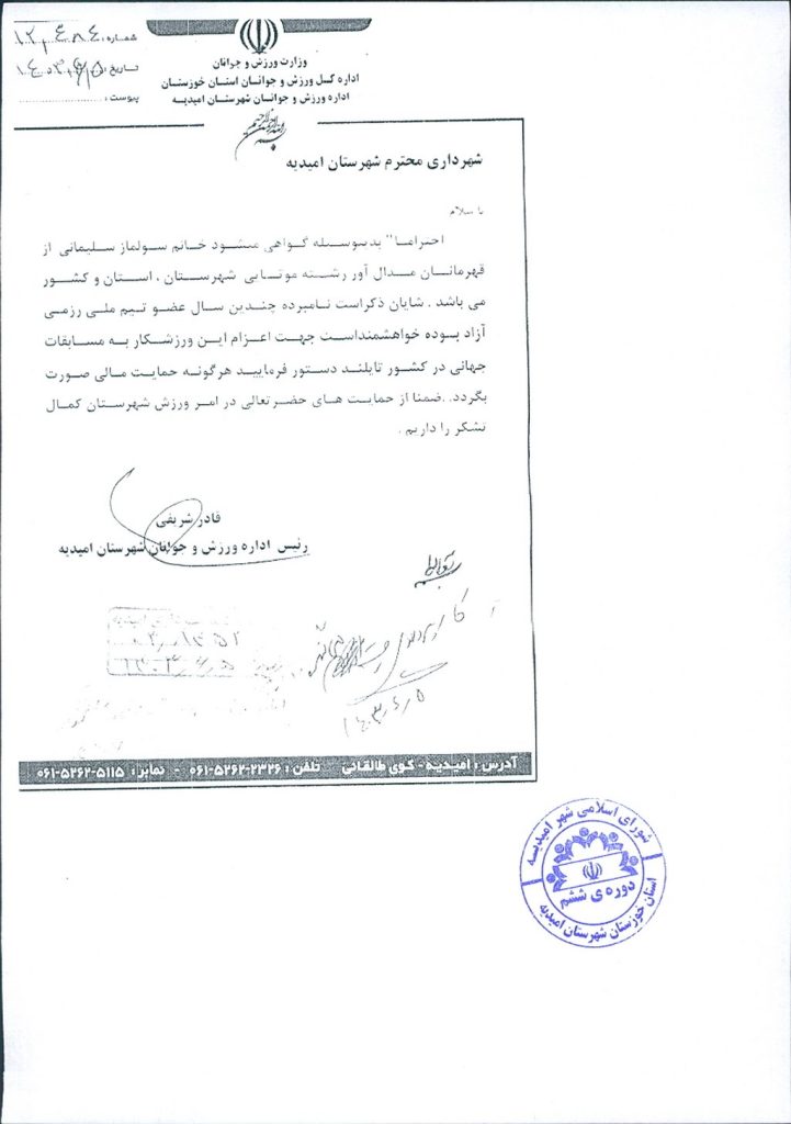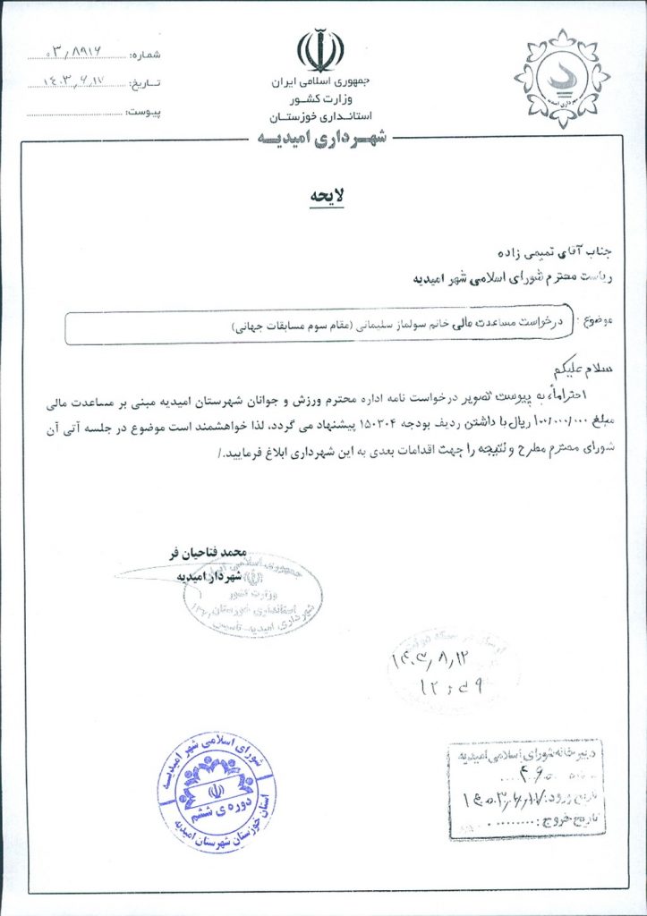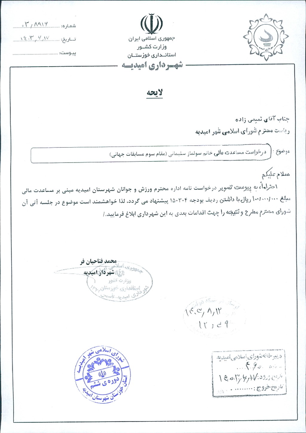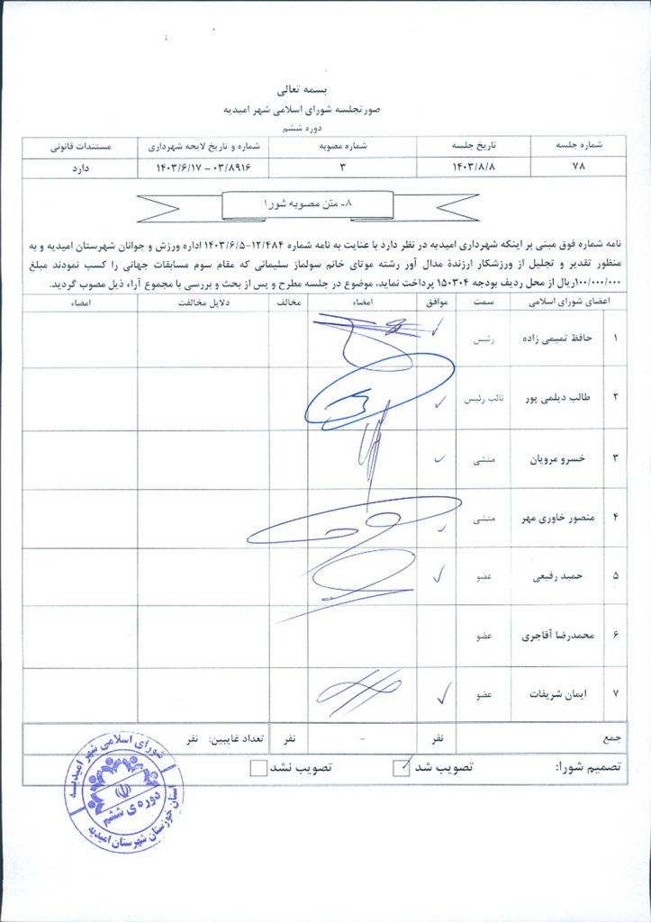 نامه شماره فوق مبنی بر اینکه شهرداري امیدیه در نظر دارد با عنایت به نامه شماره ۴۸۴/ ۱۲-۵/ ۶/ ۱۴۰۳ اداره ورزش و جوانان شهرستان امیدیه و به منظور تقدیر و تجلیل از ورزشکار ارزندۀ مدال آور رشته موتای خانم سولماز سلیمانی که مقام سوم مسابقات جهانی را کسب نمودند مبلغ ۰۰۰/۰۰۰/ ۱۰۰ریال از محل ردیف بودجه ۱۵۰۳۰۴ پرداخت نماید، موضوع در جلسه مطرح و پس از بحث و بررسي با مجموع آراء ذيل مصوب گرديد