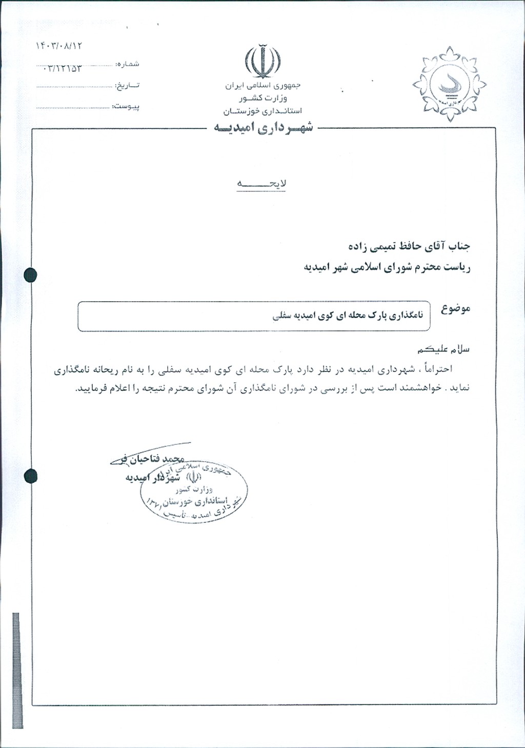 نامه شماره فوق مبنی بر اینکه شهرداری امیدیه در نظر دارد پارک محله ای کوی امیدیه سفلی را به نام ریحانه نامگذاری نماید ، موضوع در جلسه مطرح و پس از بحث و بررسي با مجموع آراء ذيل مصوب گرديد.