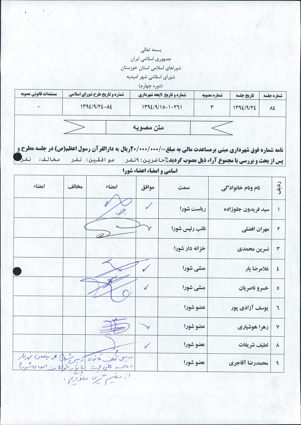 مصوبه شماره ۳ جلسه شماره ۸۴ مورخ ۹۴/۹/۲۴ شورای اسلامی شهر امیدیه