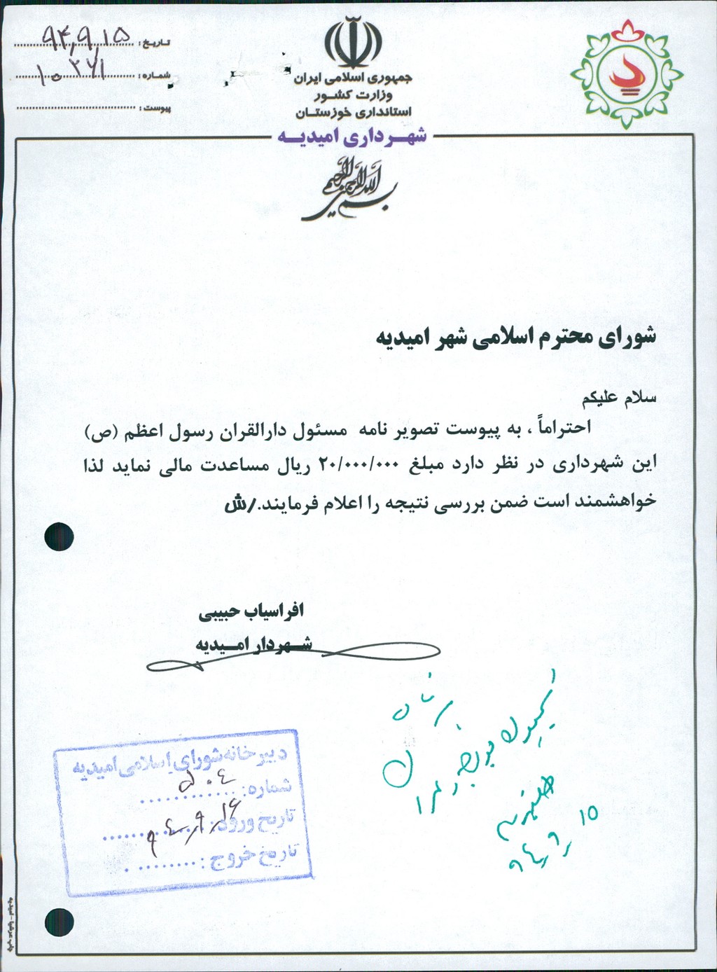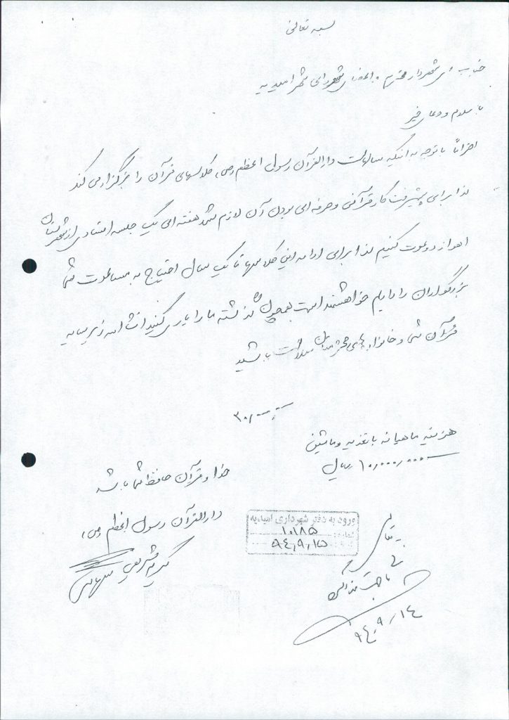 نامه شماره فوق شهرداری مبنی برمساعدت مالی به مبلغ ۲۰۰۰۰۰۰۰ ريال به دارالقرآن رسول اعظم(ص) در جلسه مطرح و پس از بحث و بررسی با مجموع آراء ذیل مصوب گردید%