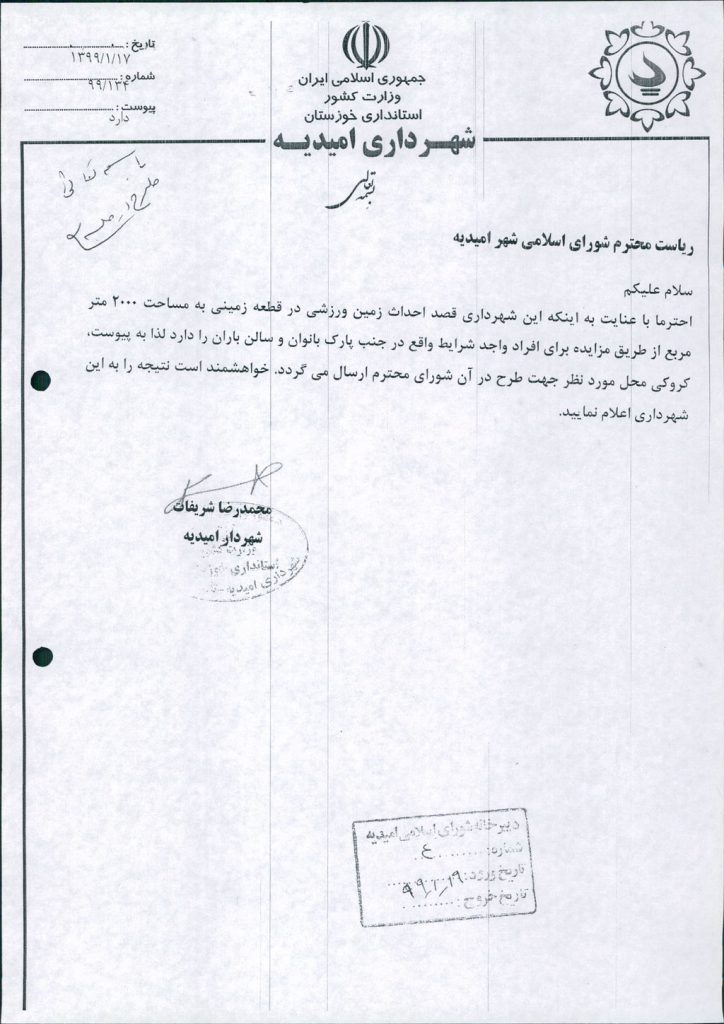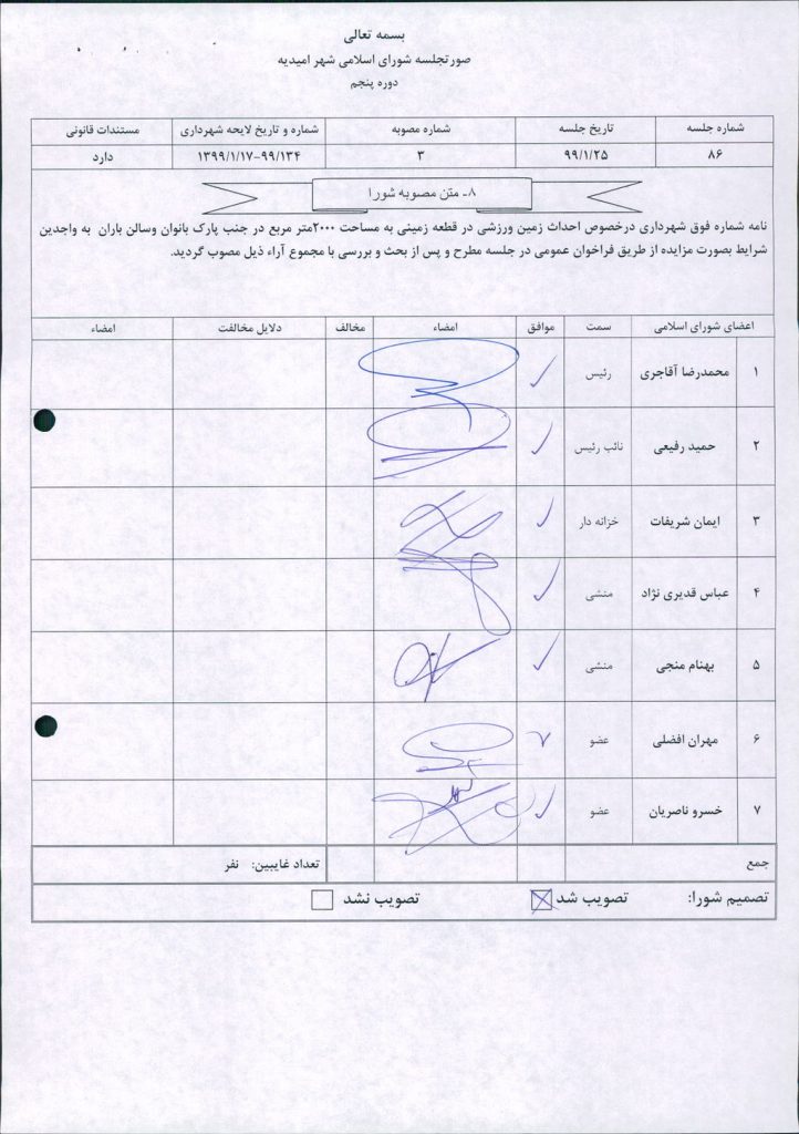 نامه شماره فوق شهرداری درخصوص احداث زمین ورزشی در قطعه زمینی به مساحت ۲۰۰۰متر مربع در جنب پارک بانوان وسالن باران به واجدین شرایط بصورت مزایده از طریق فراخوان عمومی در جلسه مطرح و پس از بحث و بررسی با مجموع آراء ذیل مصوب گردید