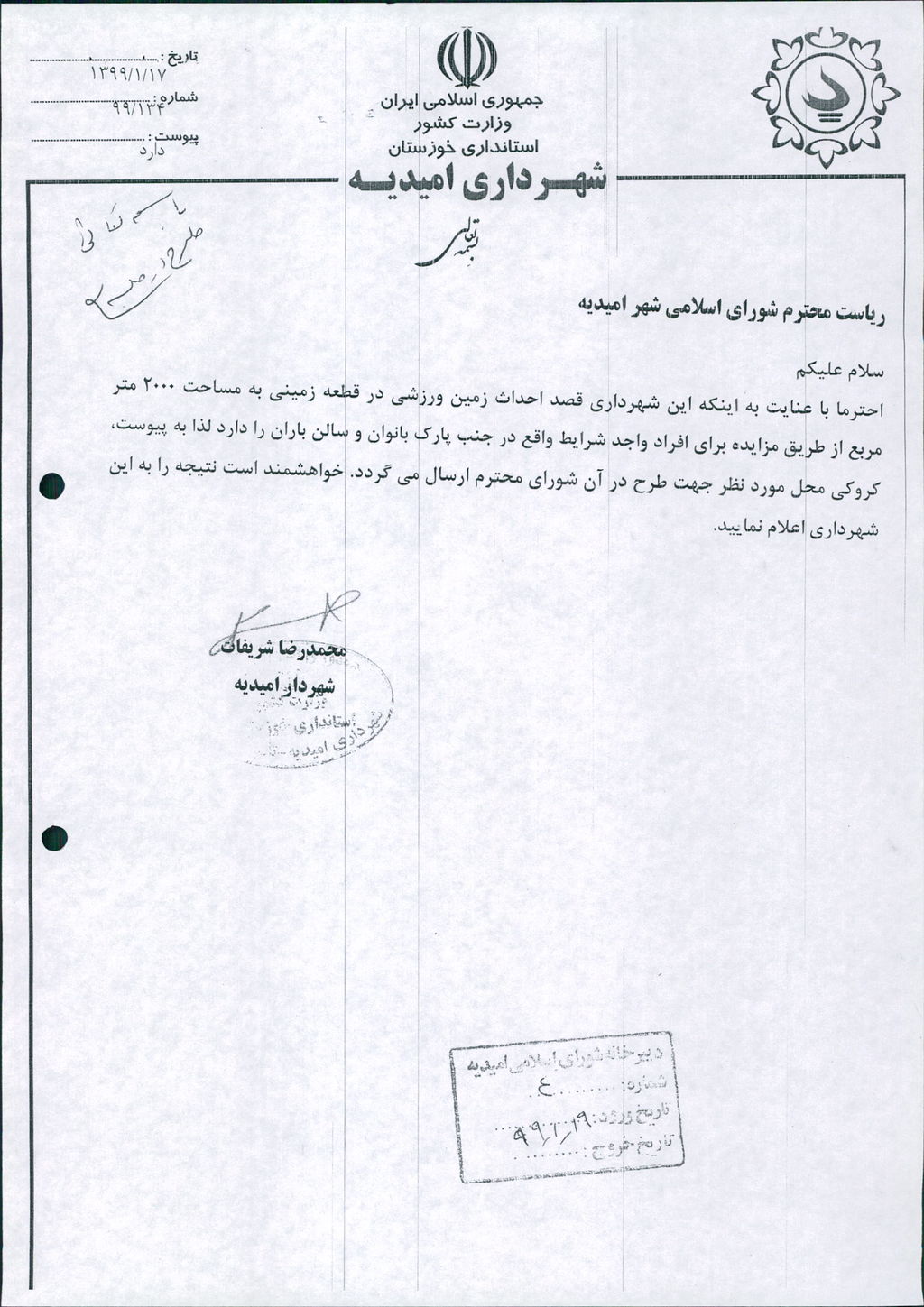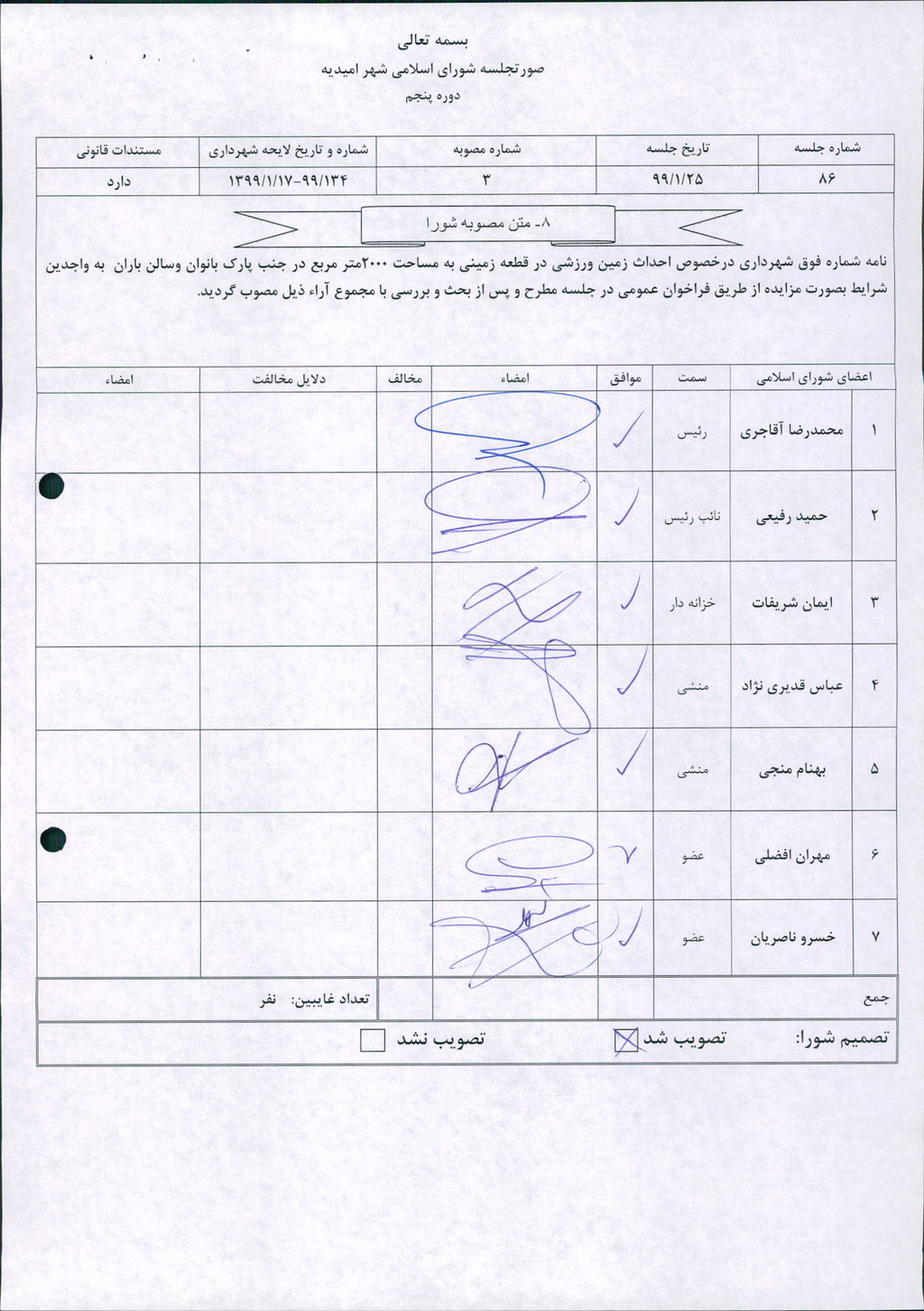مصوبه شماره ۳جلسه شماره ۸۶ شورای اسلامی شهر امیدیه