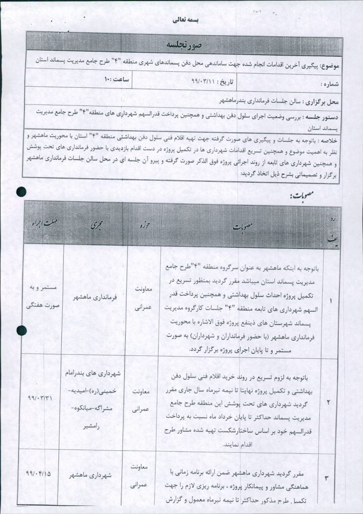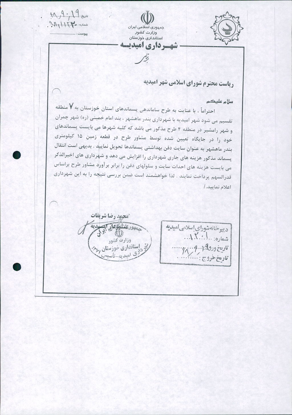 نامه شماره فوق مبنی بر اینکه شهرداری امیدیه در نظر دارد با توجه به طرح جامع مدیریت پسماند استان خوزستان نسبت به پرداخت قدرالسهم شهرداری امیدیه جهت آماده سازی مکان دفن پسماند های منطقه۴ طرح جامع مدیریت پسماند استان واقع در ۱۵کیلومتری جاده ماهشهر به امیدیه به شرط دراختیار گذاشتن ۲دستگاه خودرو انتقال (سمیتریلر) و۲دستگاه کشنده و ایجاد شرکت تعاونی برای بهره مندی شهرداری امیدیه از تمام عواید آن، اقدام نماید، که موضوع در جلسه مطرح و پس از بحث و بررسی با مجموع آراء ذیل مصوب گردید.