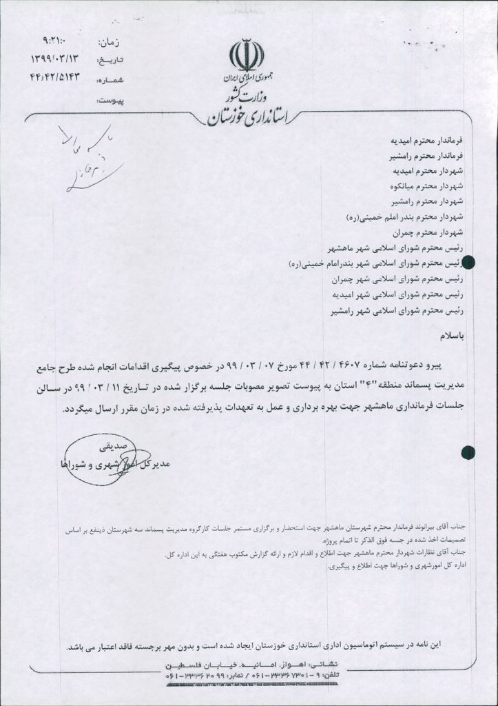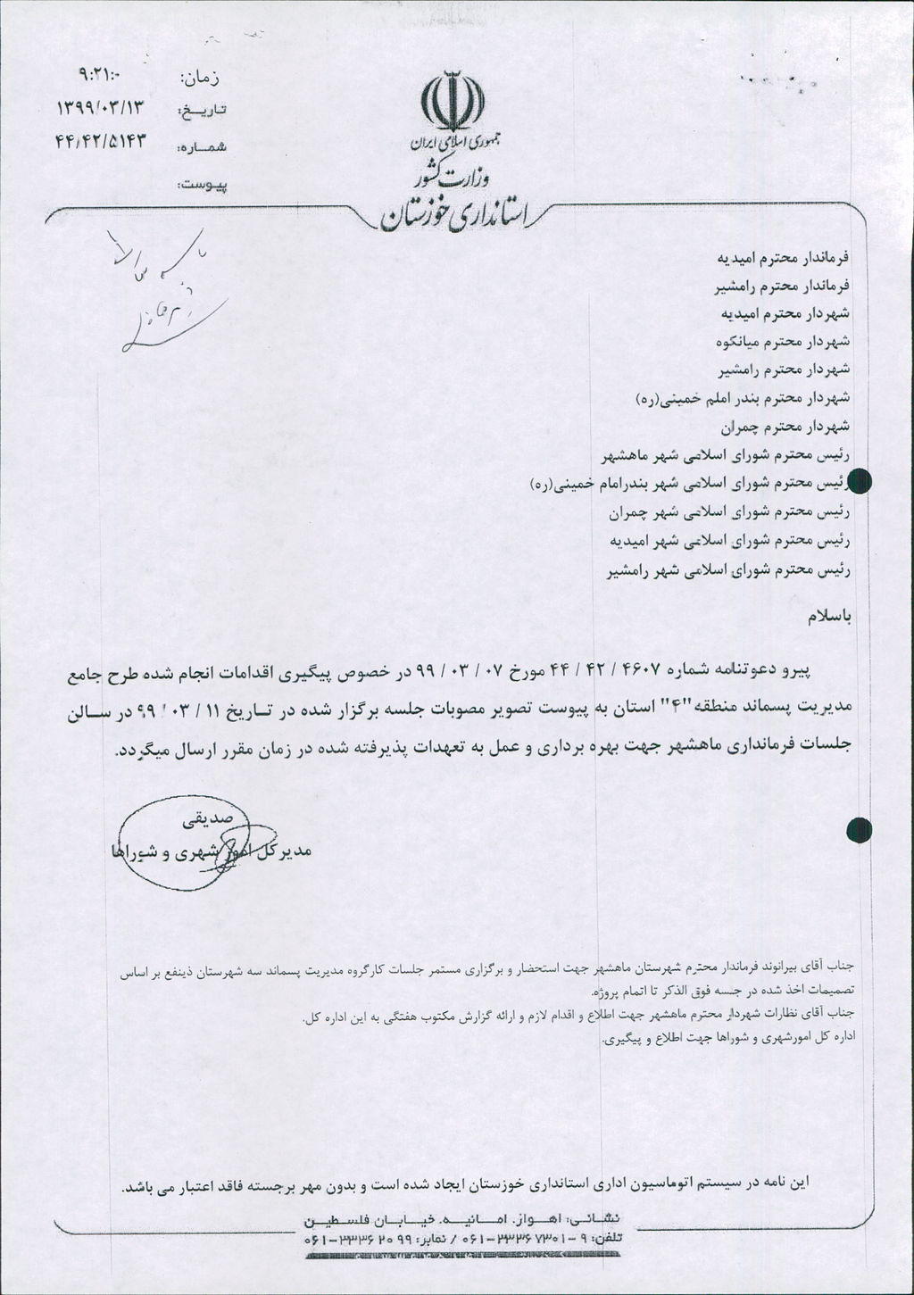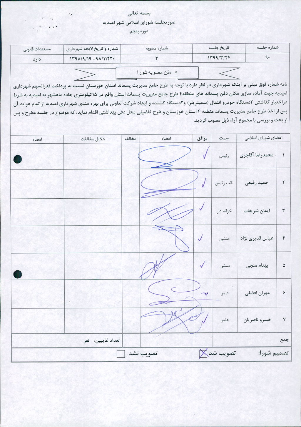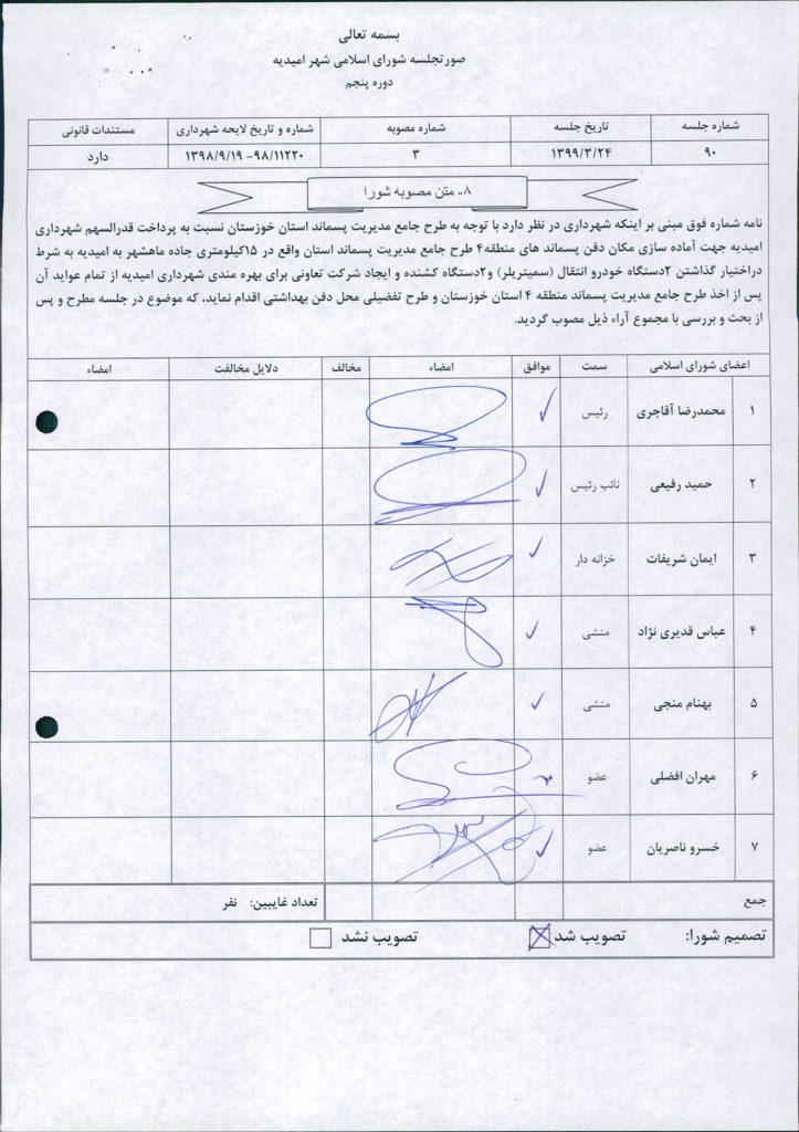 مصوبه شماره ۳ جلسه شماره ۹۰ مورخ ۹۹/۳/۲۴ شورای اسلامی شهر امیدیه