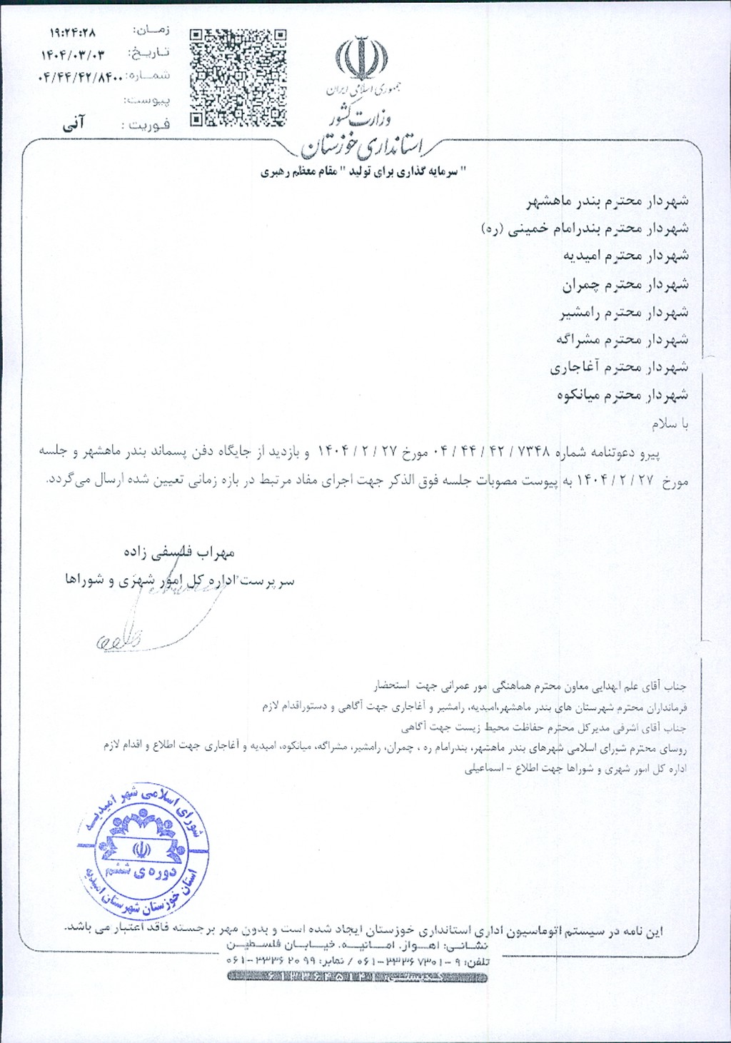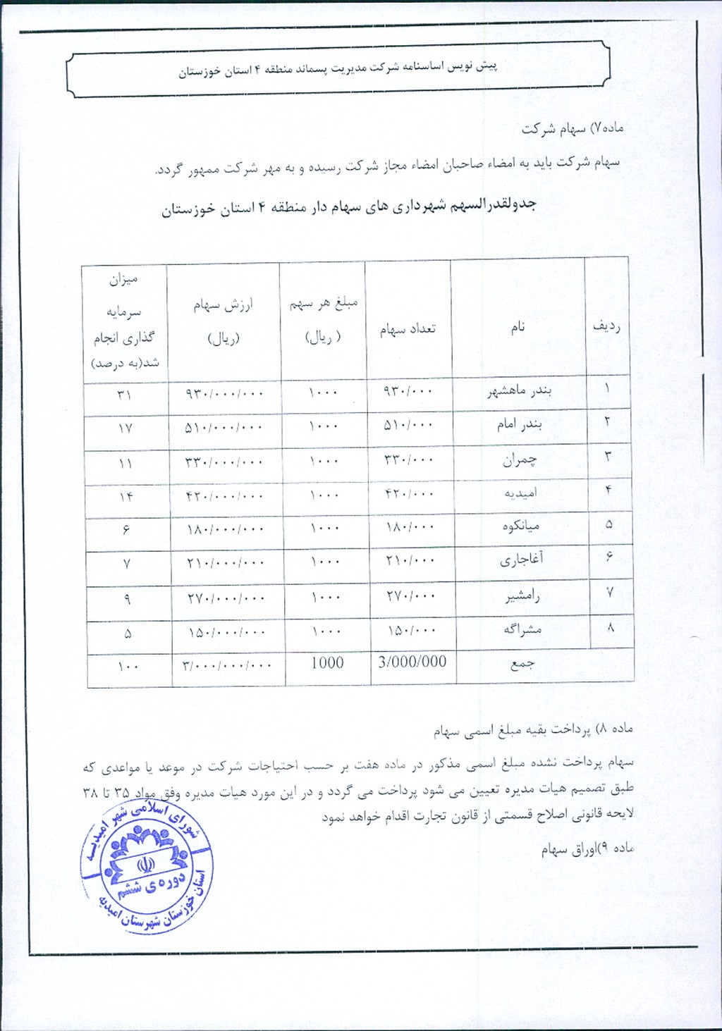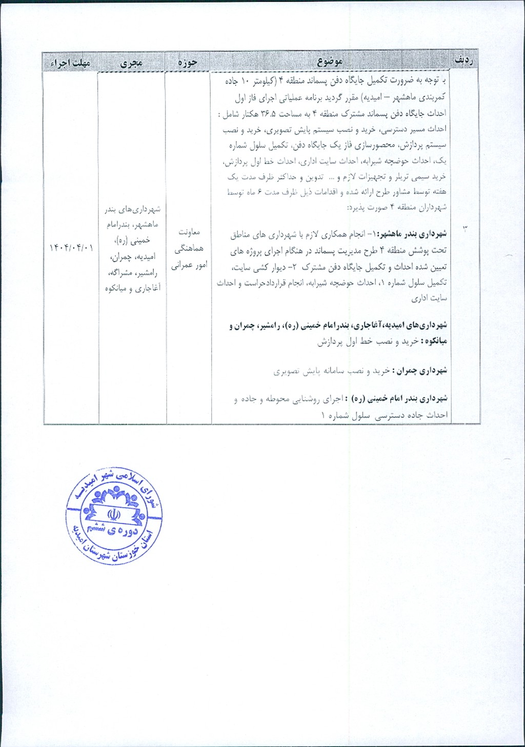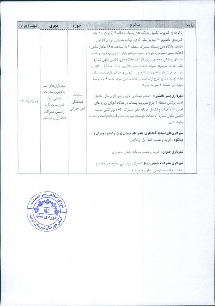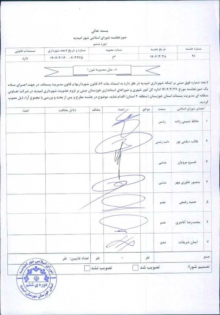 مصوبه شماره ۳ جلسه شماره ۹۱ شورای اسلامی شهر امیدیه