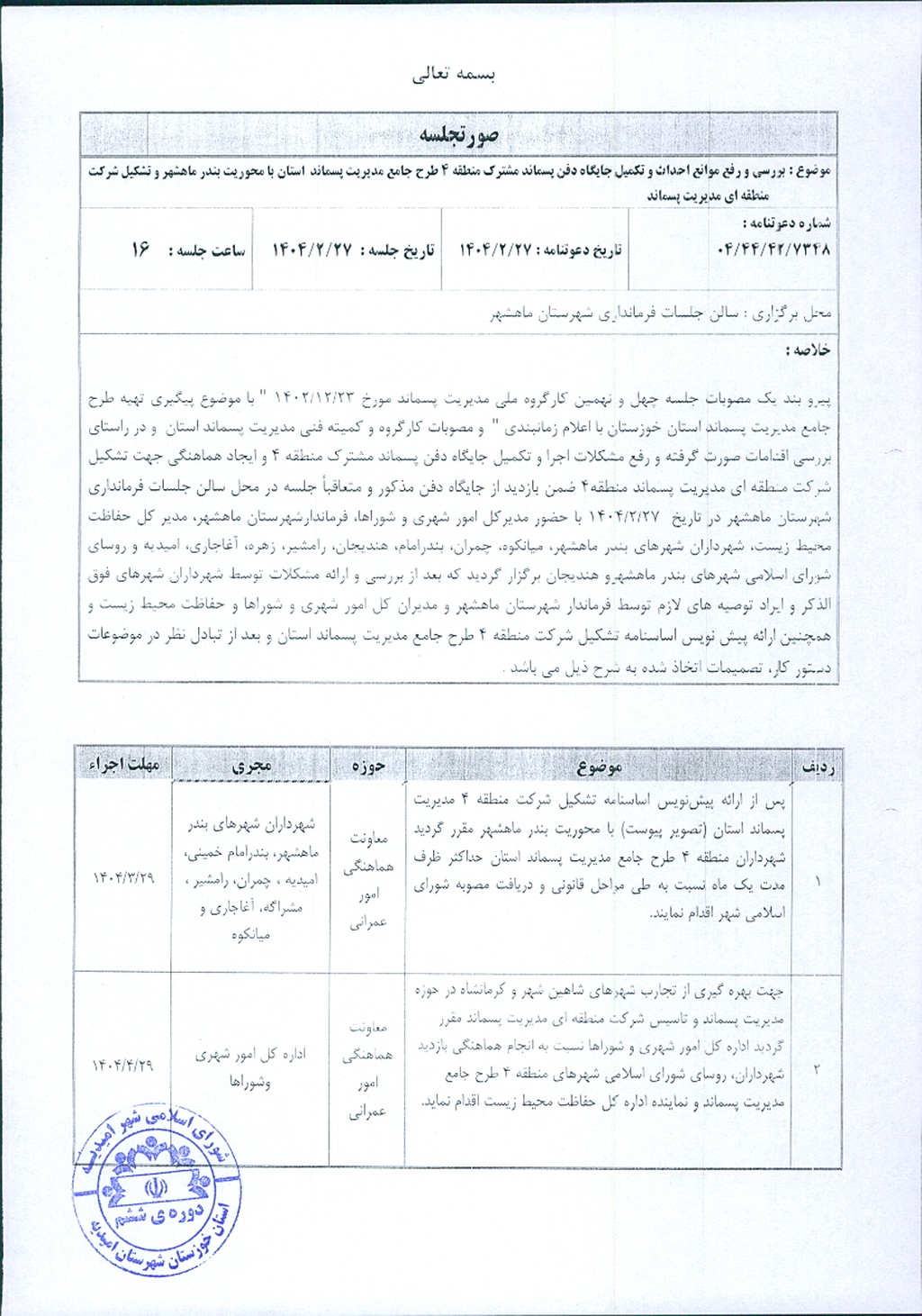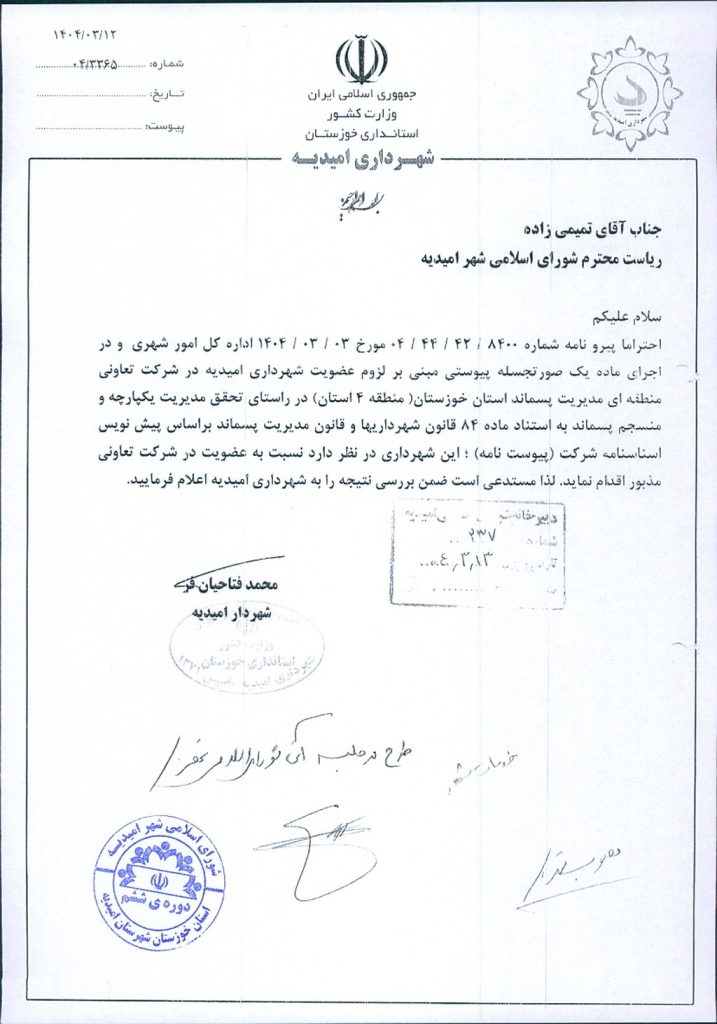 لایحه شماره فوق مبنی بر اینکه شهرداری امیدیه در نظر دارد به استناد ماده ۸۴ قانون شهرداریها و قانون مدیریت پسماند، در جهت اجرای ماده یک صورتجلسه مورخ ۲۷/ ۲/ ۱۴۰۴ اداره کل امور شهری و شوراهای استانداری خوزستان مبنی بر لزوم عضویت شهرداری امیدیه در شرکت تعاونی منطقه ای مدیریت پسماند استان خوزستان (منطقه ۴ استان) اقدام نماید، موضوع در جلسه مطرح و پس از بحث و بررسی با مجموع آراء ذیل مصوب گردید.