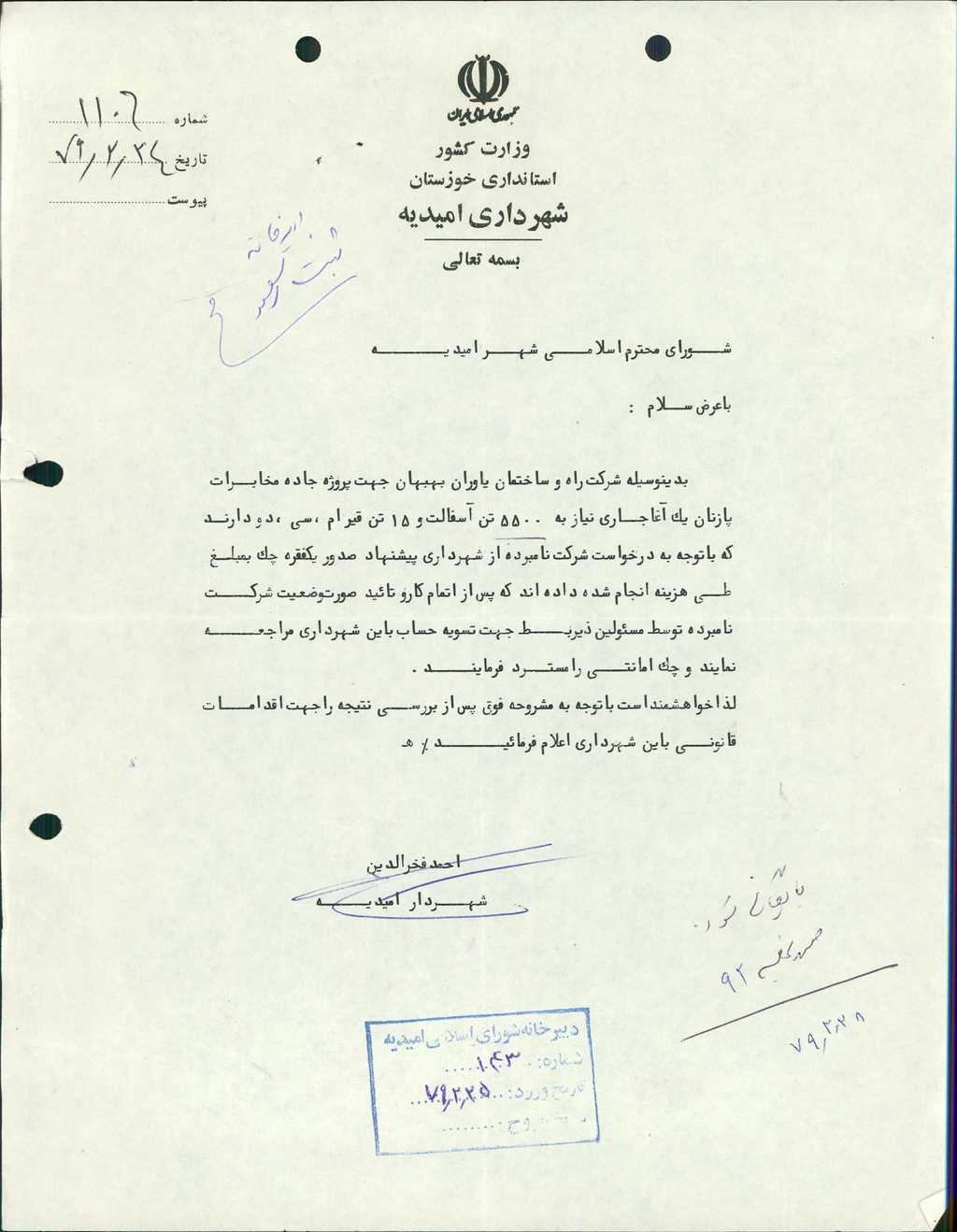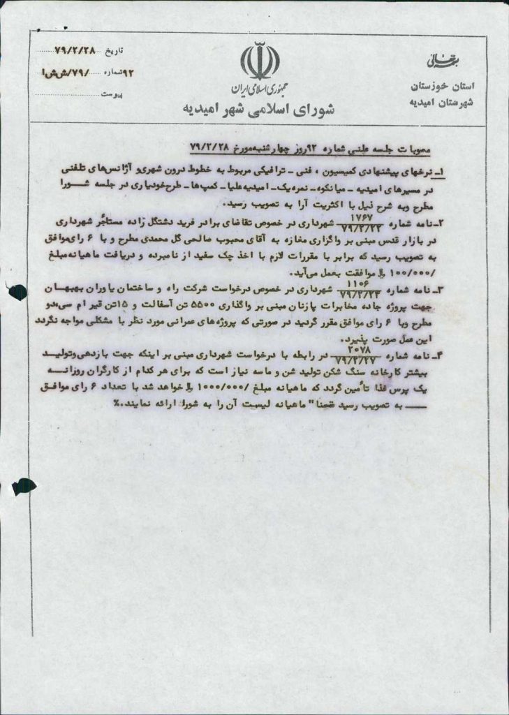 مصوبه شماره ۳ جلسه شماره ۹۲ شورای اسلامی شهر امیدیه