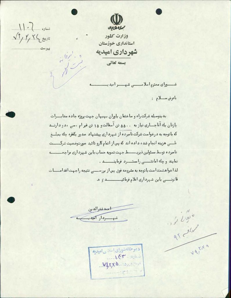 ۳-نامه شماره ۱۱۰۶مورخ ۲۳/ ۲/ ۷۹شهرداري در خصوص درخواست شركت راه و ساختمان ياوران بهبهان جهت پروژه جاده مخابرات پازنان مبني بر واگذاري ۵۵۰۰تن آسفالت و ۱۵تن قير ام سي ، دو مطرح و با ۶ رأي موافق مقرر گرديددر صورتي كه پروژه هاي عمراني مورد نظر با مشكلي مواجه نگردد اين عمل صورت پذيرد.