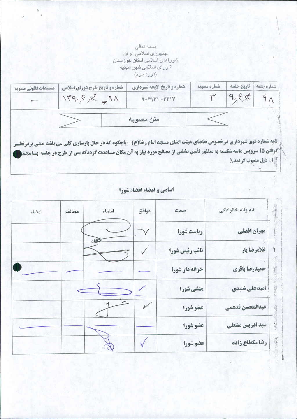 مصوبه شماره ۳ جلسه شماره ۹۸ شورای اسلامی شهر امیدیه