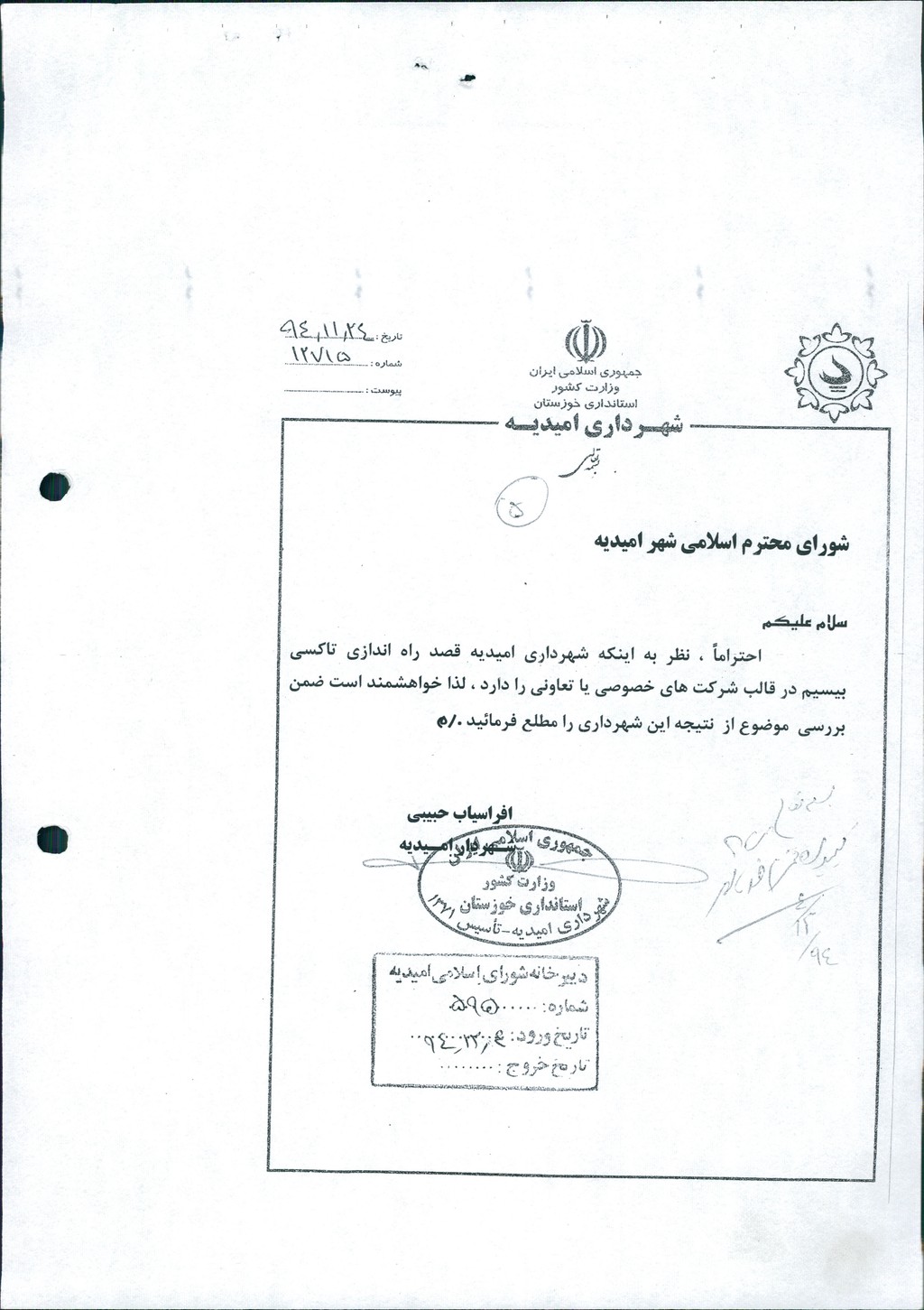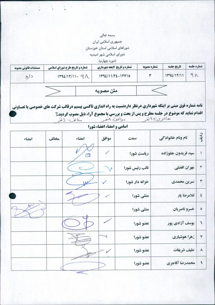 مصوبه شماره ۳ جلسه شماره ۹۸ شورای اسلامی شهر امیدیه