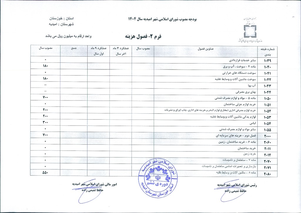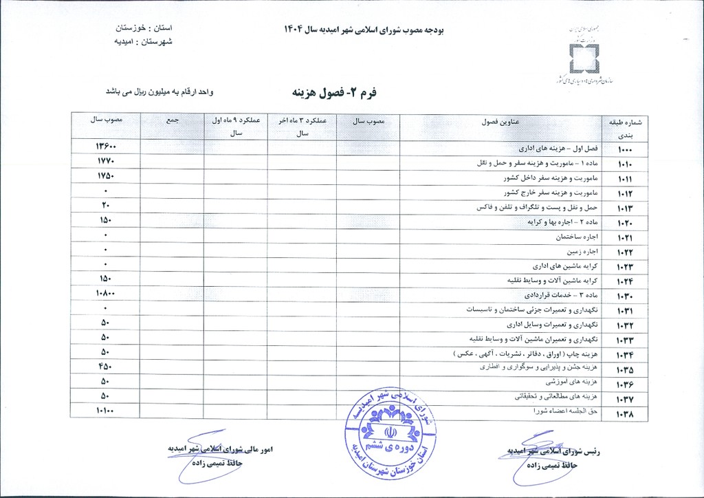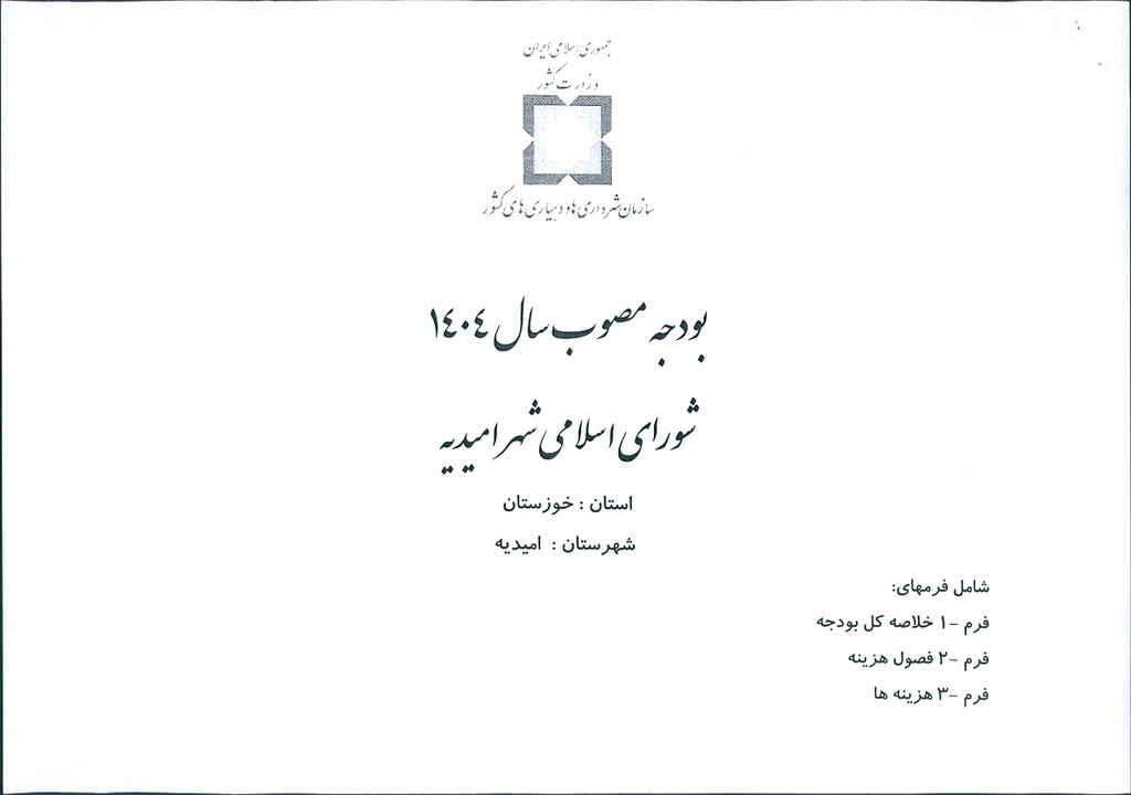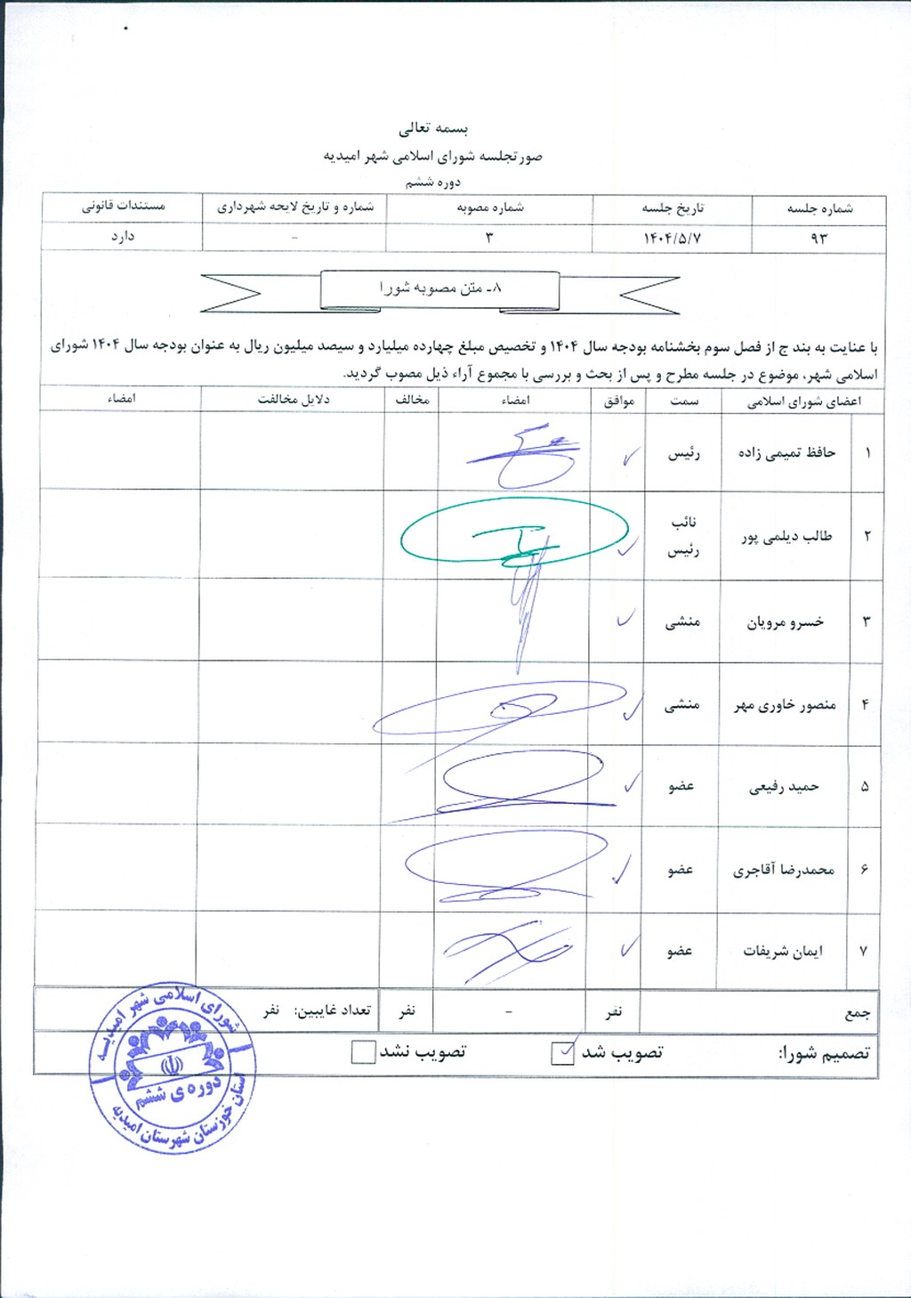 مصوبه شماره ۳ جلسه شماره ۹۳ شورای اسلامی شهر امیدیه